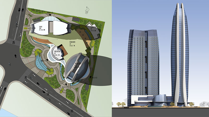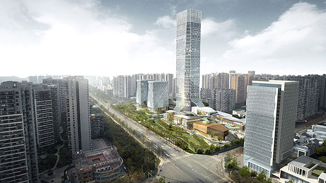 項目位于成都市天府新區(qū)中央商務(wù)區(qū),為該區(qū)域重大產(chǎn)業(yè)項目。用地位于中央生態(tài)帶和東西向軸線寧波路的交匯之處,地理位置極為重要。地面總建筑面積為21萬平方米,分為兩座35層和45層超高層塔樓,建筑高度分別為160米和220米。