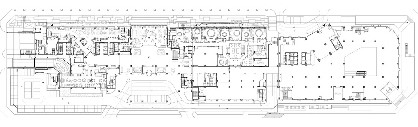 地塊東、北側(cè)規(guī)劃為住宅及配套設(shè)施;北側(cè)住宅高低錯落布置,東側(cè)住宅偏西15度角,以提高日照和景觀視野,并形成豐富的空間序列。南側(cè)為香格里拉大酒店和購物中心,酒店擁有420間客房,及在當?shù)厥浊恢傅?,600平方米宴會廳??头俊⑷詹蛷d、大堂吧、宴會前廳等均朝向中央公園。購物中心布置在人流較多的十字路口,與酒店連接為一體,以實現(xiàn)經(jīng)濟效果的相輔相成。