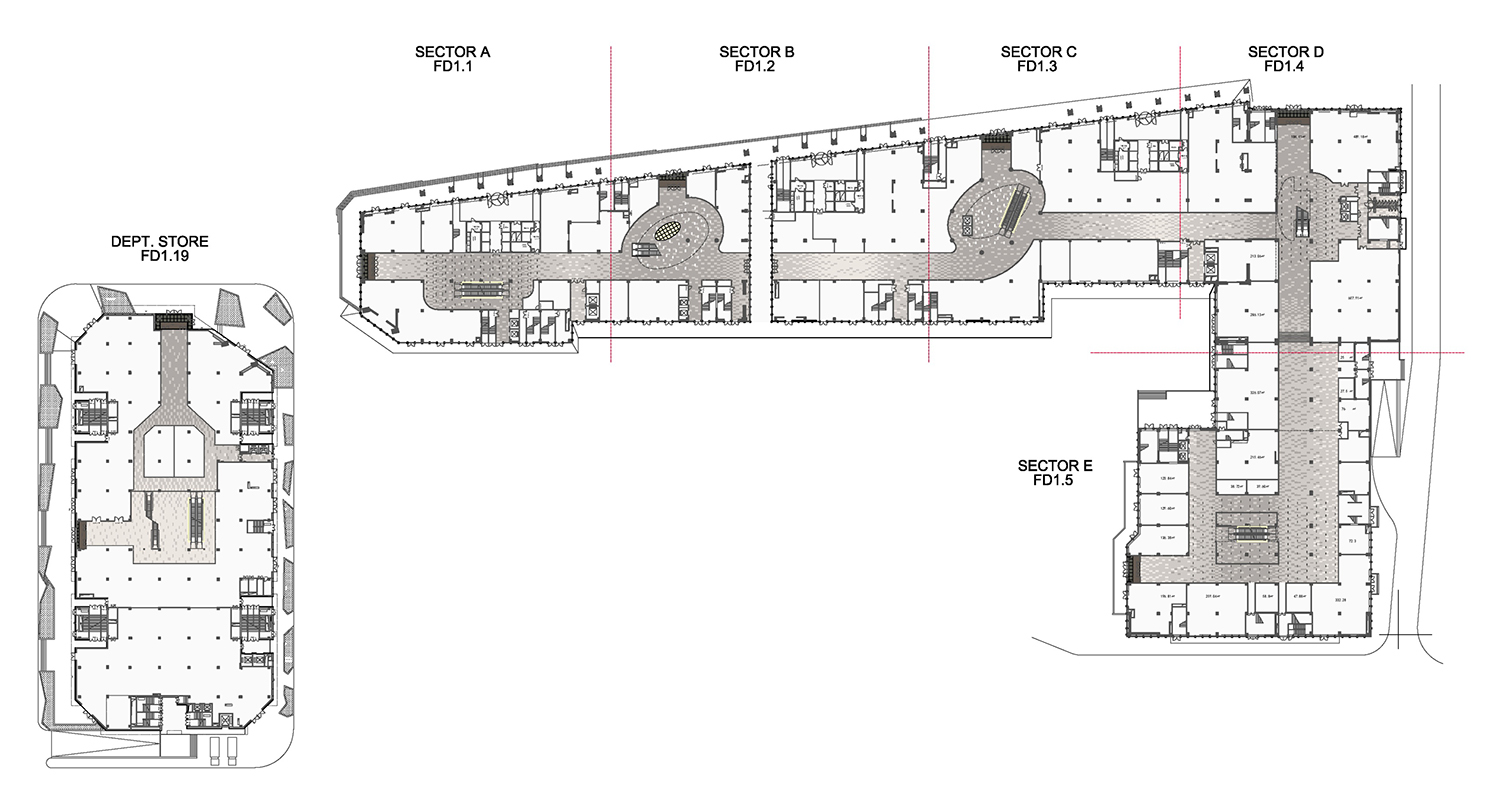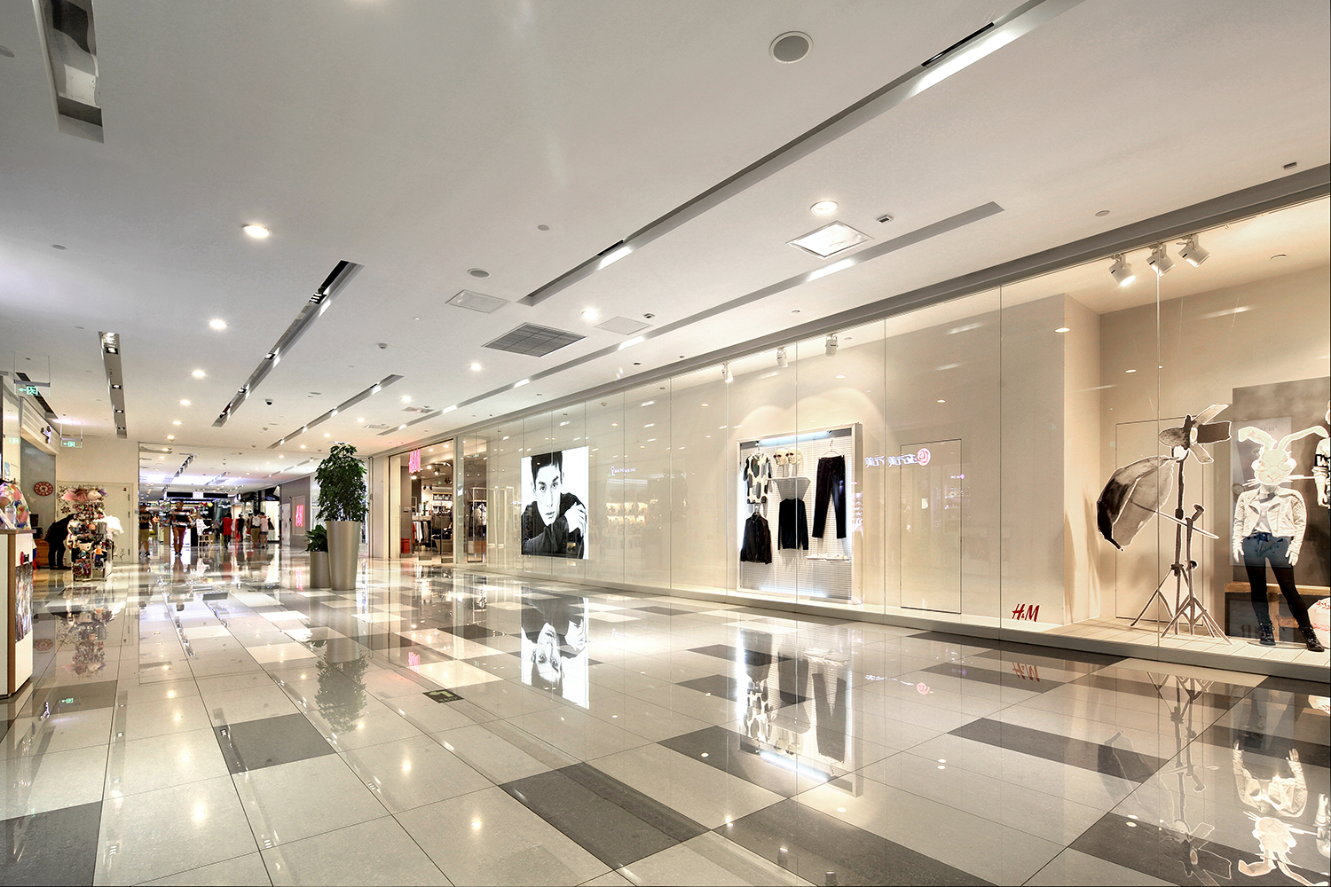 建筑外觀設(shè)計(jì)采用幾何分割的陣列效果突顯商務(wù)風(fēng)。室內(nèi)空間則同樣延續(xù)建筑的設(shè)計(jì)元素,采用規(guī)律性的幾何圖案呼應(yīng)整個(gè)建筑的設(shè)計(jì)語言??臻g內(nèi)部動(dòng)線的合理設(shè)計(jì)決定了購物環(huán)境的便捷及消費(fèi)者的線路指引,中庭則使用律動(dòng)性較強(qiáng)的弧線作為交通樞紐的動(dòng)線引導(dǎo),使設(shè)計(jì)在視覺及心理影響都發(fā)揮到最極致的作用。同時(shí)結(jié)合燈光設(shè)計(jì)的裝飾效果也為空間增添一抹活躍的購物氛圍。