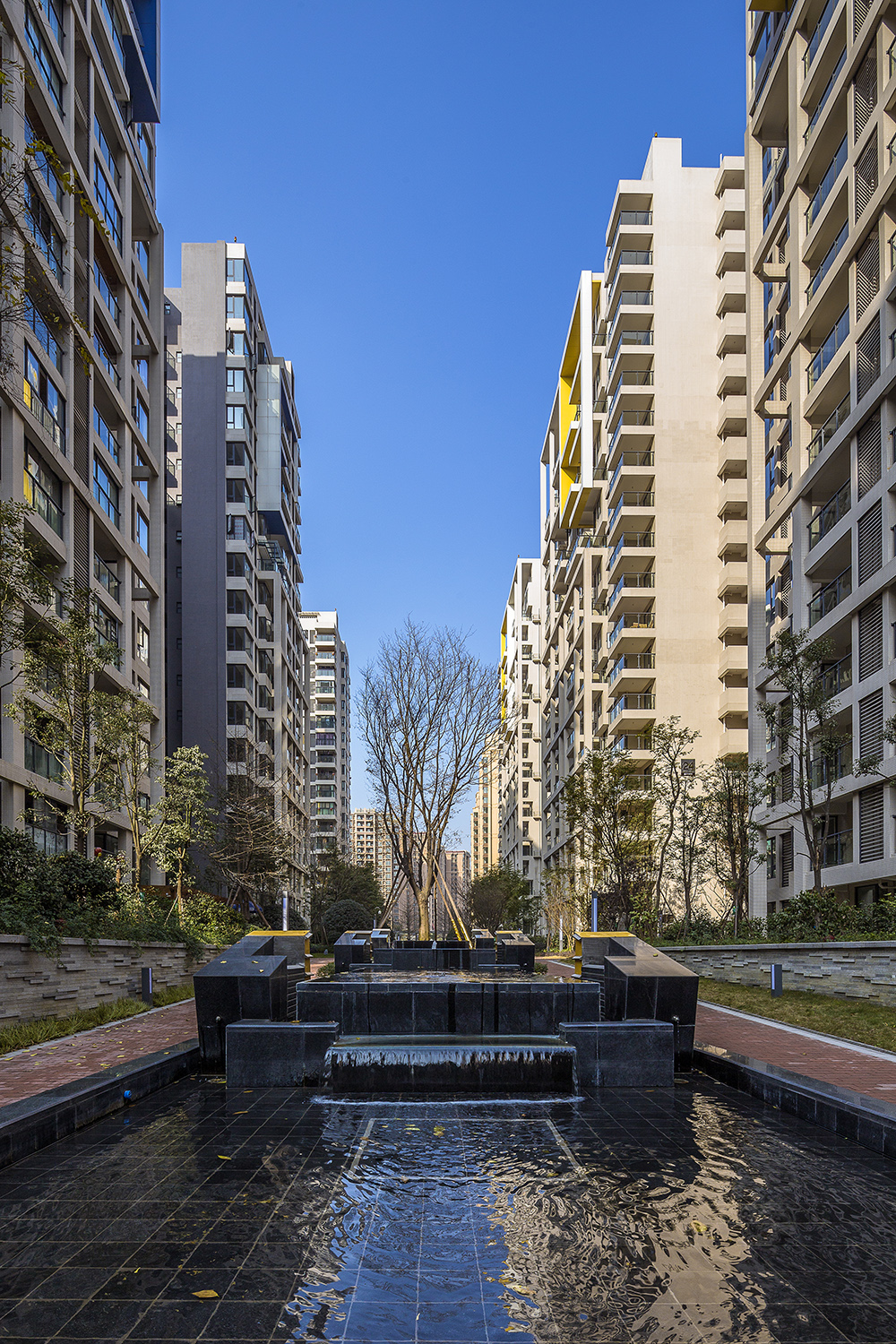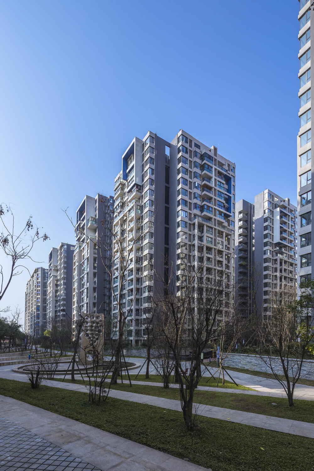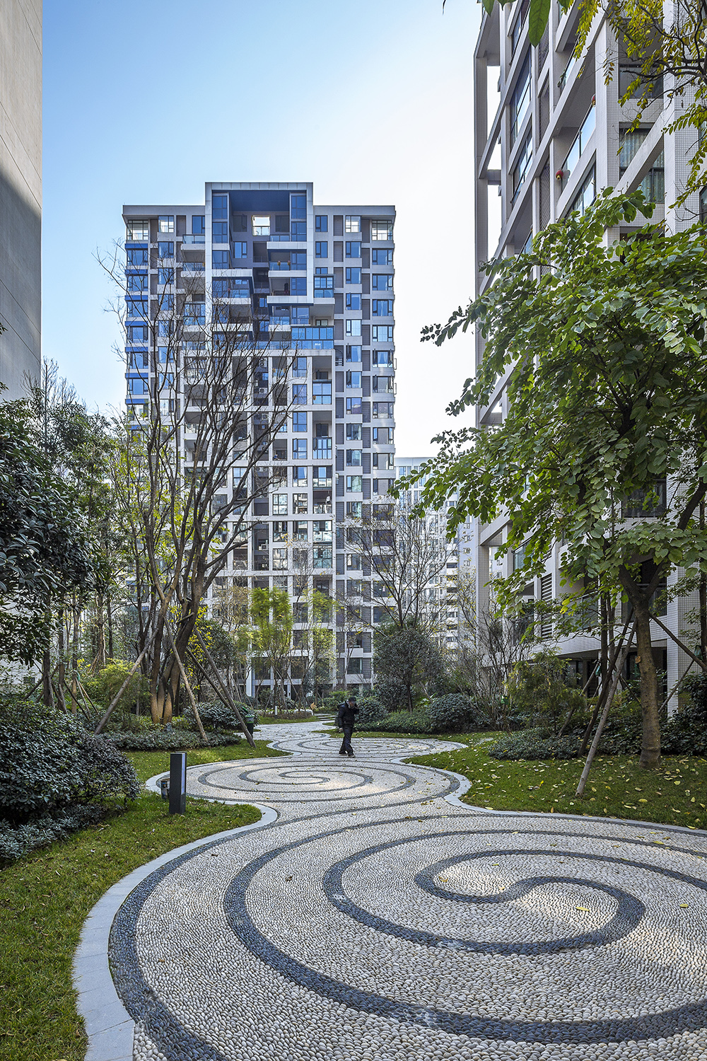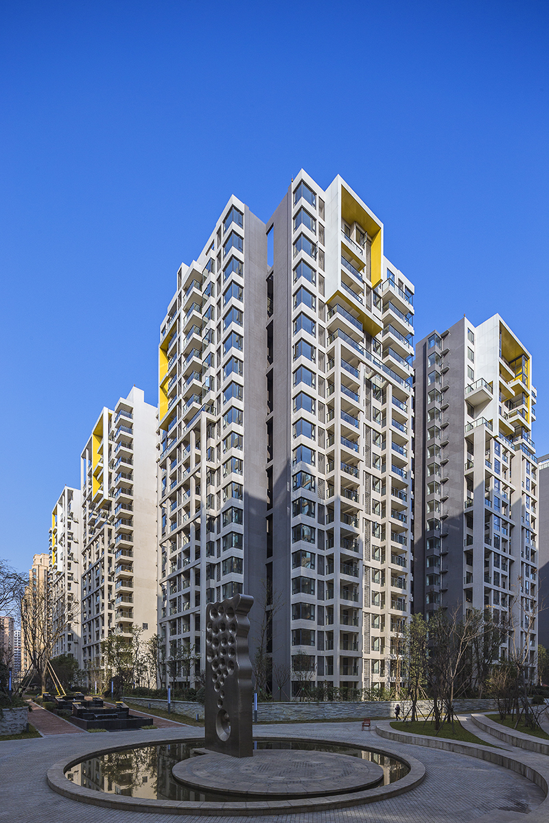 設(shè)計(jì)充分結(jié)合成都地區(qū)日照的優(yōu)勢(shì),以半圍合布局為主,形成空間組團(tuán),并分區(qū)導(dǎo)入景觀主體園林,實(shí)現(xiàn)了高強(qiáng)度開(kāi)發(fā)并保障社區(qū)優(yōu)質(zhì)居住環(huán)境品質(zhì)的設(shè)計(jì)挑戰(zhàn)。設(shè)計(jì)開(kāi)始時(shí),就確定了以科技和綠色環(huán)保為發(fā)展高度,以新加坡建屋局Green Mark環(huán)保認(rèn)證為設(shè)計(jì)要求,其中地源熱泵系統(tǒng)的運(yùn)用成為包括會(huì)所在內(nèi)的公共區(qū)域的能源供給,對(duì)于公共區(qū)域能源消耗所關(guān)聯(lián)的物管成本控制起到關(guān)鍵作用,地面雨水的收集和再利用,也成為項(xiàng)目節(jié)能的另一個(gè)亮點(diǎn),除此之外的整套綠色建筑控制系統(tǒng),使本項(xiàng)目成為西南地區(qū)最早獲得國(guó)際 “綠色建筑”認(rèn)證的住區(qū)。
