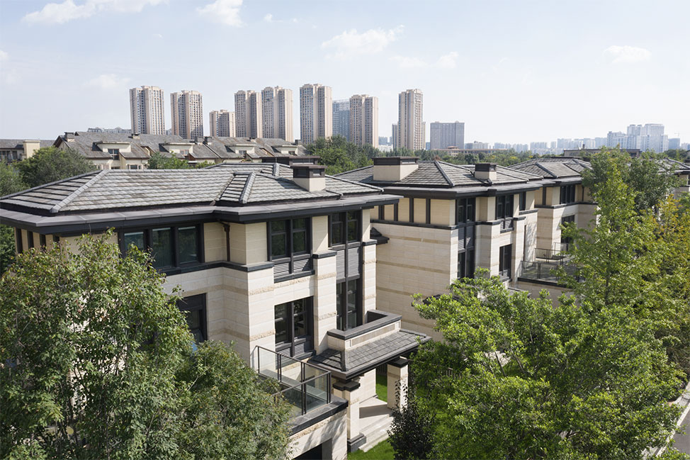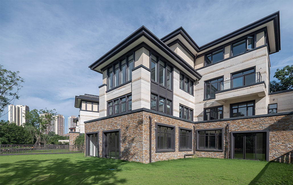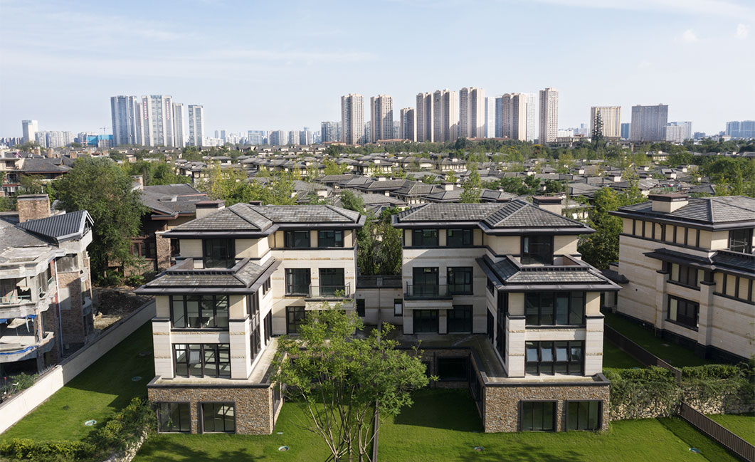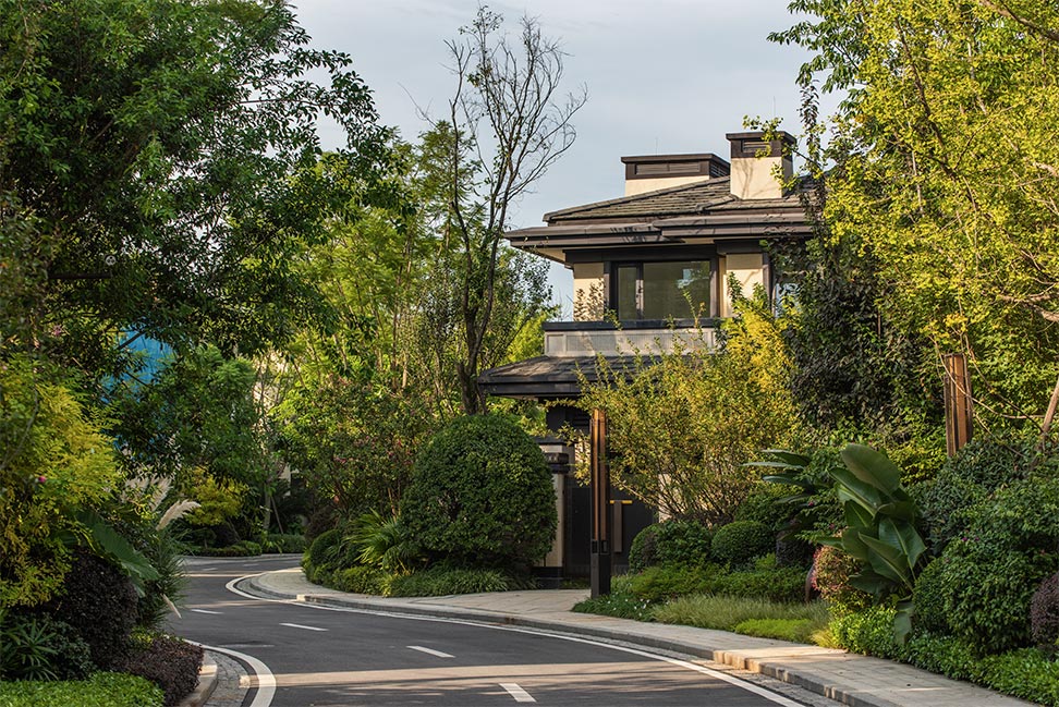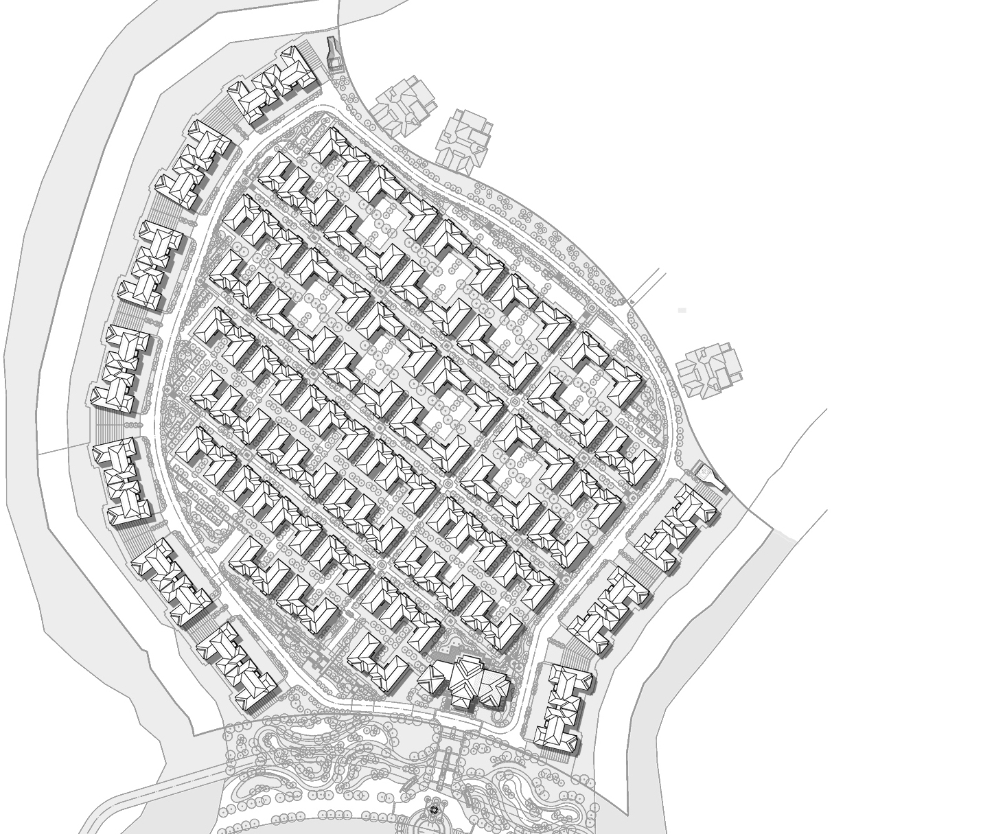 項(xiàng)目位于成都市金牛區(qū),為華僑城東岸六期地塊,三面臨水,南側(cè)為項(xiàng)目已建內(nèi)部道路。占地84,506平方米,有一層地下室,地面上由41棟2層住宅、10棟3層住宅和1棟2層服務(wù)用房構(gòu)成,總建筑面積:65,878平方米,其中地面以上30,000平方米 ,項(xiàng)目用地東西兩側(cè)靠景觀內(nèi)河,沿兩側(cè)布置大戶型住宅,保證大戶型住宅在小區(qū)中享有最大化的景觀資源,彰顯奢華品質(zhì);在用地中部打造內(nèi)聚性景觀,將較大戶型住宅作為一個(gè)組合整體布置于此;在中部與外側(cè)之間采用靈活的組合方式布置較小戶型住宅,充分利用外部景觀資源及自身的圍合景觀,使每戶均有良好的景觀朝向;在小區(qū)主入口設(shè)置商業(yè)用房,方便服務(wù)整個(gè)小區(qū)。