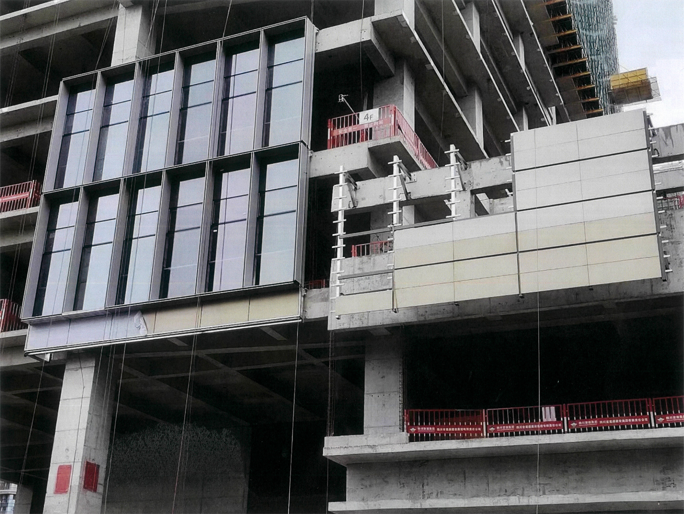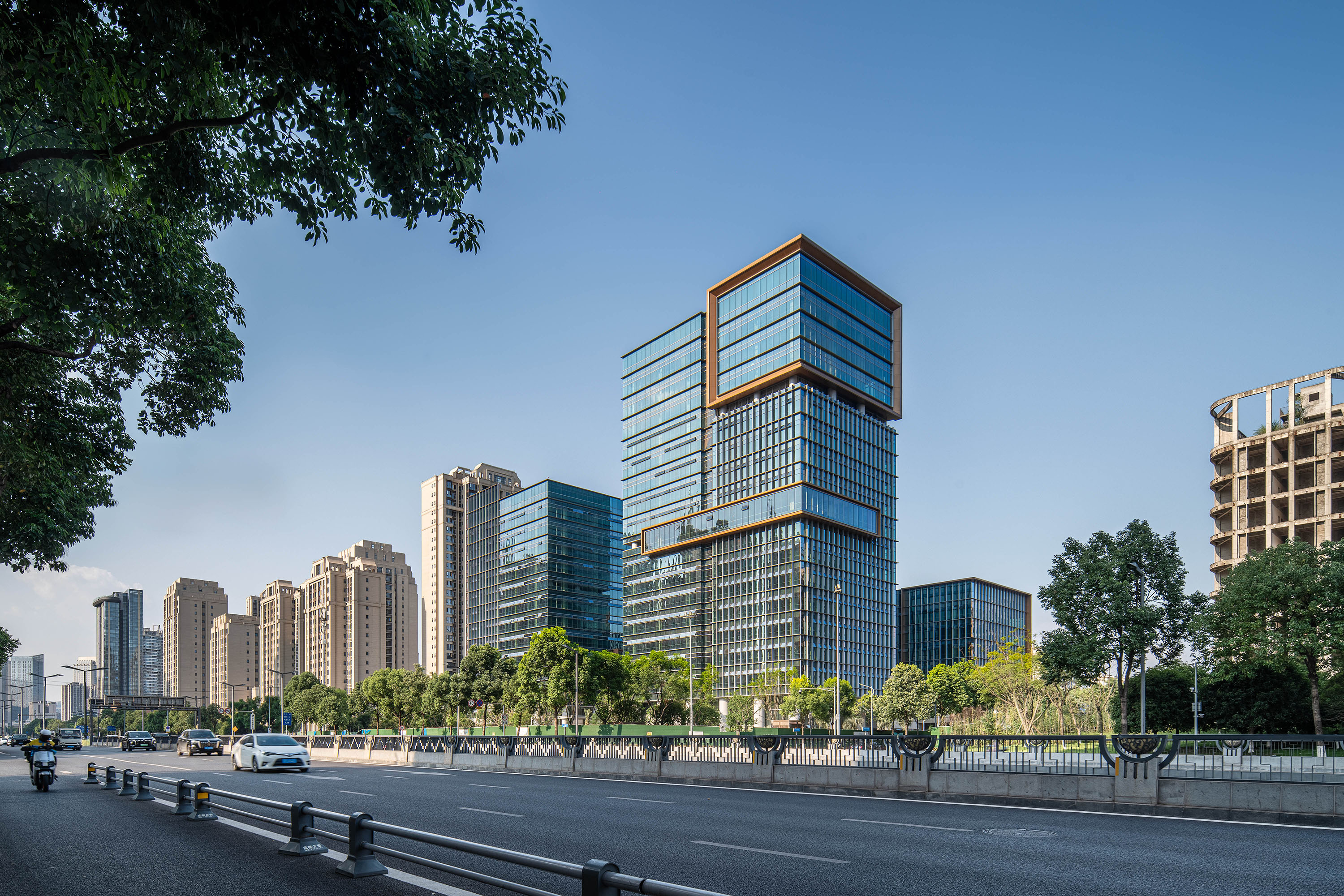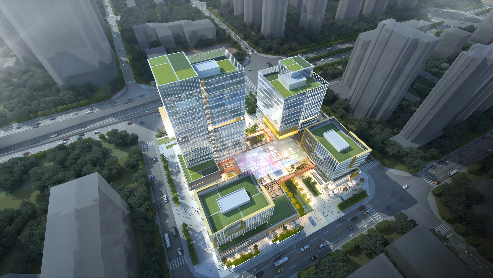 項目主要包括四棟辦公樓、裙房及中間圍合而成的廣場。高低錯落的兩棟塔樓臨近西側城市主干道,另外兩棟低層辦公樓位于項目東側。四棟建筑形成錯落有致的空間形態(tài)和連貫而豐富的城市天際線。標志性的裸眼3D屏幕位于項目最高辦公樓的頂部,是宣傳、引流的高新之窗。