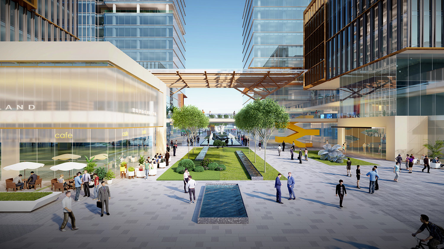 四棟辦公塔樓圍合,在基地內部形成了一個以立體的步行空間為主導的下沉式商業(yè)廣場和城市花園,建筑內部如會議洽談、發(fā)布會、藝術裝置等多種功能與城市聯系起來,多元化的業(yè)態(tài)承載著豐富的城市場景。