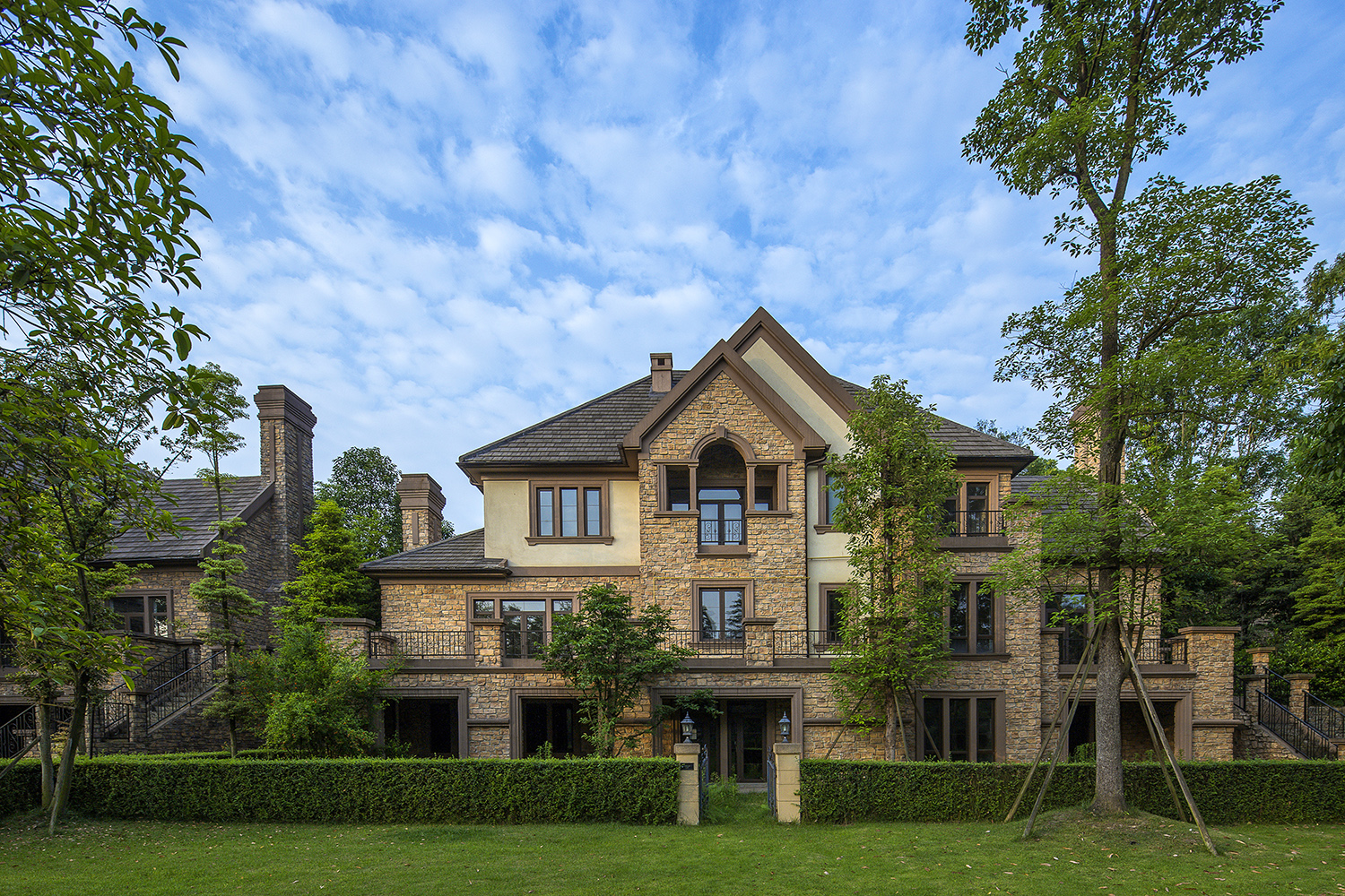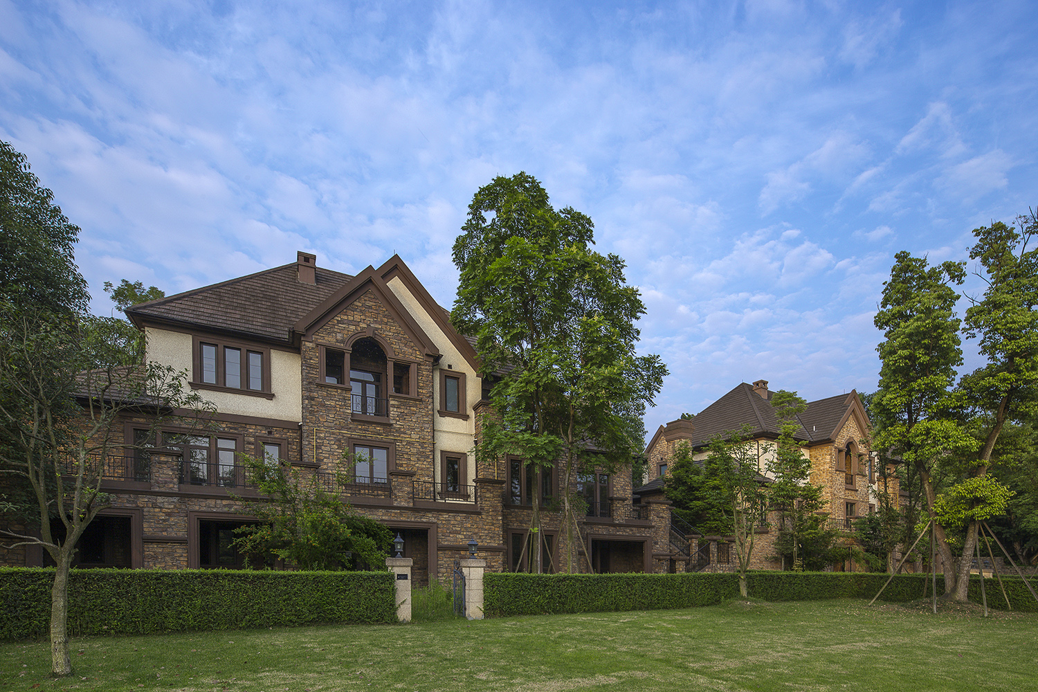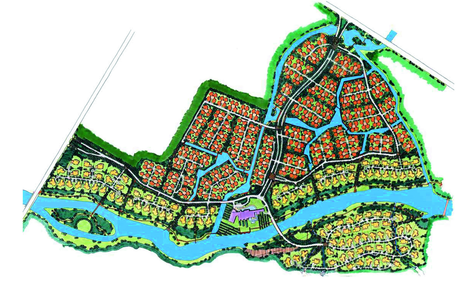 項目緊臨風景優(yōu)美的牧馬山,擁有獨一無二的生態(tài)環(huán)境。設(shè)計始終強調(diào)生態(tài)社區(qū)感,營造人與自然的交流空間。項目采用傳統(tǒng)庭院式的布局,每幢別墅既有前院,又有內(nèi)庭和私家后花院。在總體規(guī)劃和建筑功能的設(shè)計上,參照北美式別墅建筑的現(xiàn)代風格,形成組團式布置模式,每個組團的建筑的朝向均經(jīng)過精心考量,根據(jù)不同的景觀條件,設(shè)計不同的別墅類型,使得建筑與整體環(huán)境氛圍非常和諧。