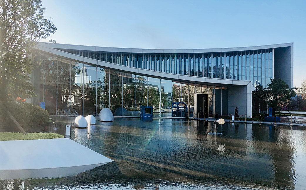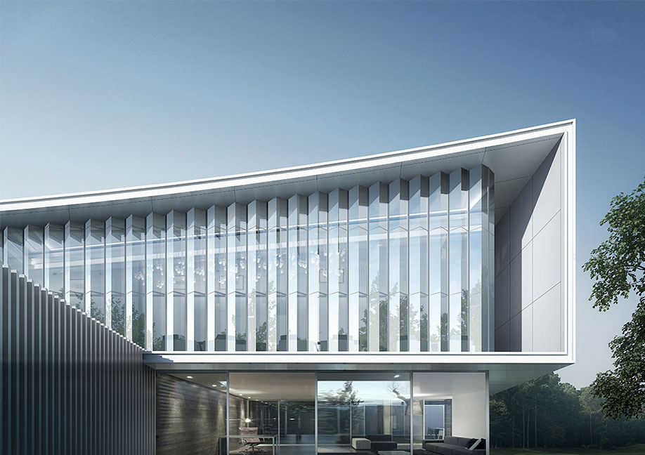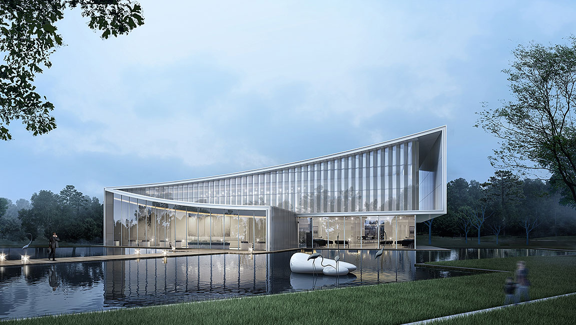 設(shè)計(jì)提煉莆田的印象與地域文化,將媽祖建筑屋頂概念置入設(shè)計(jì)之中。以現(xiàn)代挺拔的幾何線條,勾勒出靈動(dòng)的弧形屋面,形成高低錯(cuò)落的形體節(jié)奏。通過(guò)豎向玻璃幕墻的有序結(jié)拼疊,達(dá)到輕巧簡(jiǎn)潔、虛實(shí)有致的審美體驗(yàn)的同時(shí),也引入了莆田水景流動(dòng)的韻律感。大面積的玻璃幕墻通透如玉,與水中倒映虛實(shí)交錯(cuò)互為對(duì)景,再由天光云影充當(dāng)背景,營(yíng)造出“清風(fēng)徐來(lái),水波不興”的生態(tài)美感和恬淡心境。