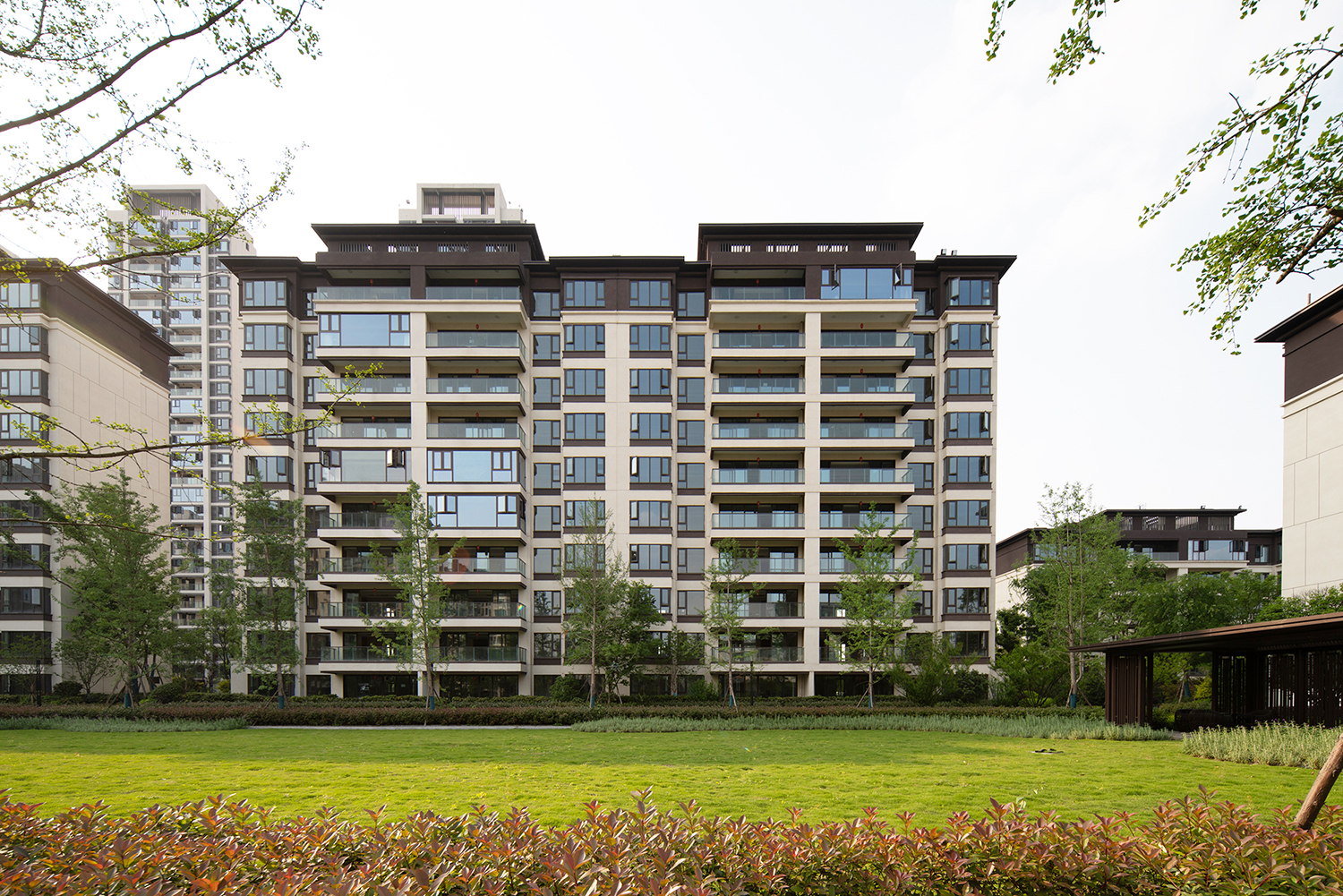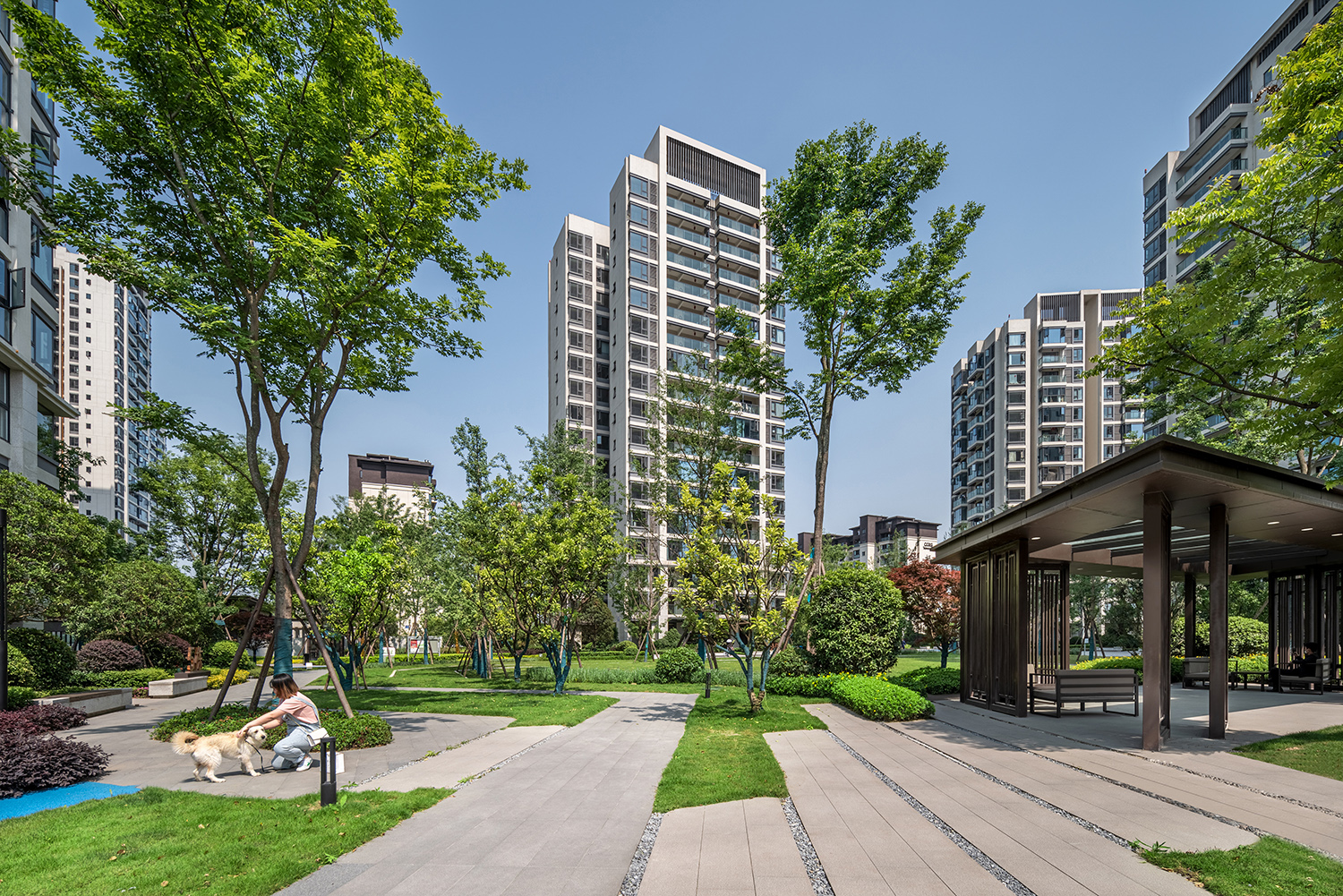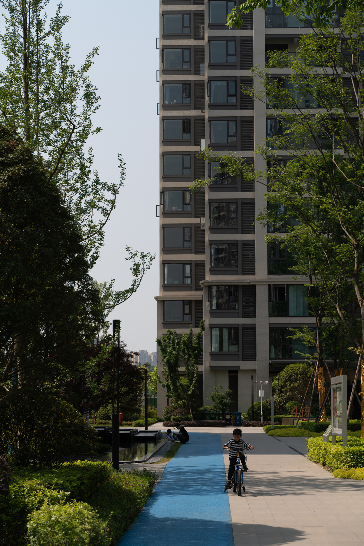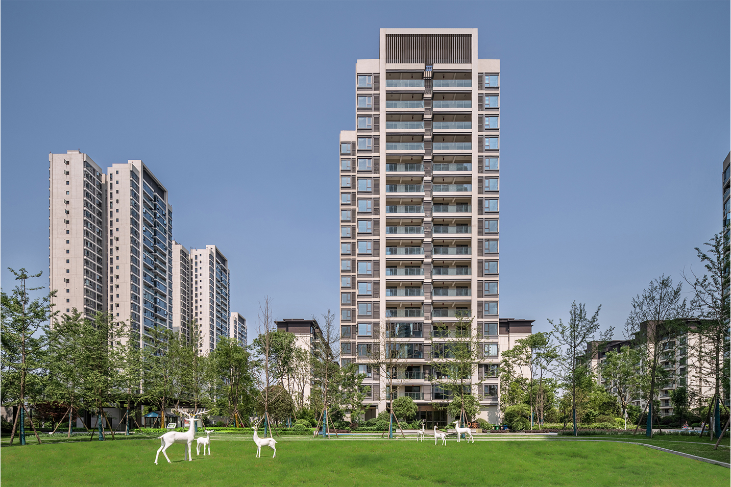格柵、光影、留白為社區(qū)平添了迷人的靜謐之感。項(xiàng)目不僅充分考慮與城市外部空間環(huán)境的融合,也非常注重內(nèi)部建筑形態(tài)尺度的變化與雕琢。
