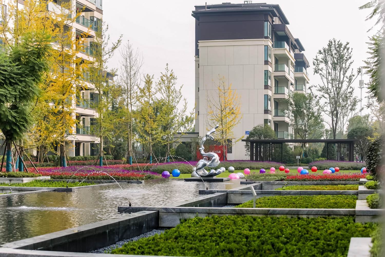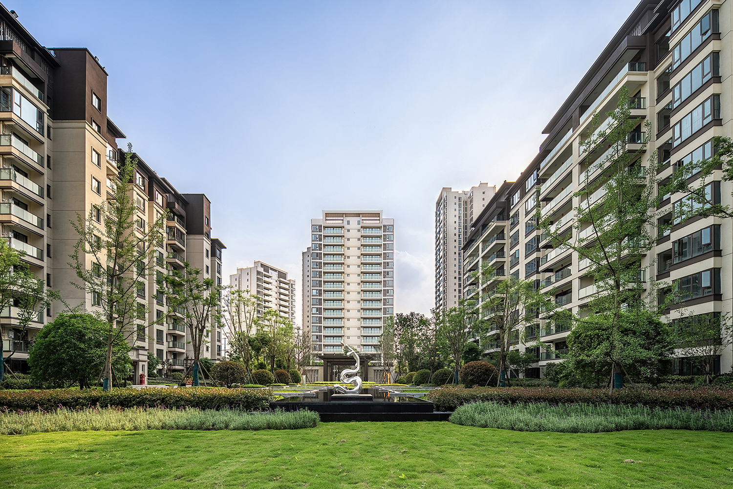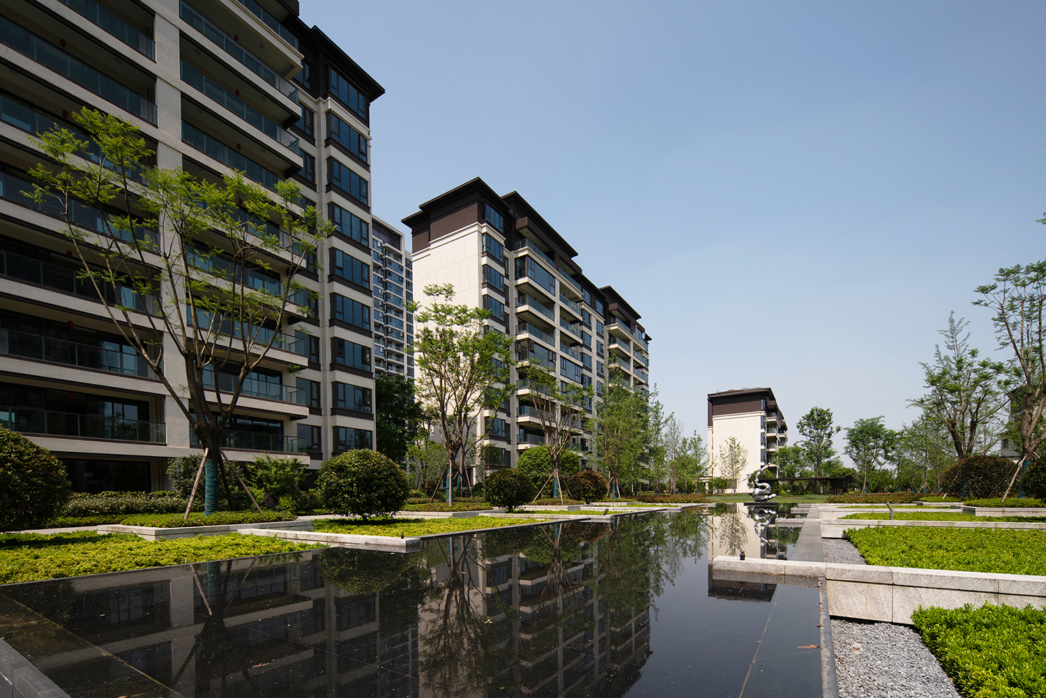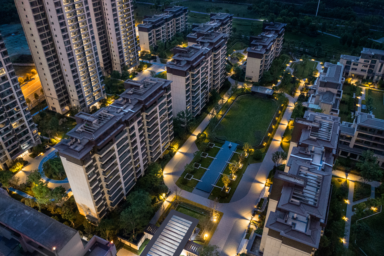 格柵、光影、留白為社區(qū)平添了迷人的靜謐之感。項(xiàng)目不僅充分考慮與城市外部空間環(huán)境的融合,也非常注重內(nèi)部建筑形態(tài)尺度的變化與雕琢。