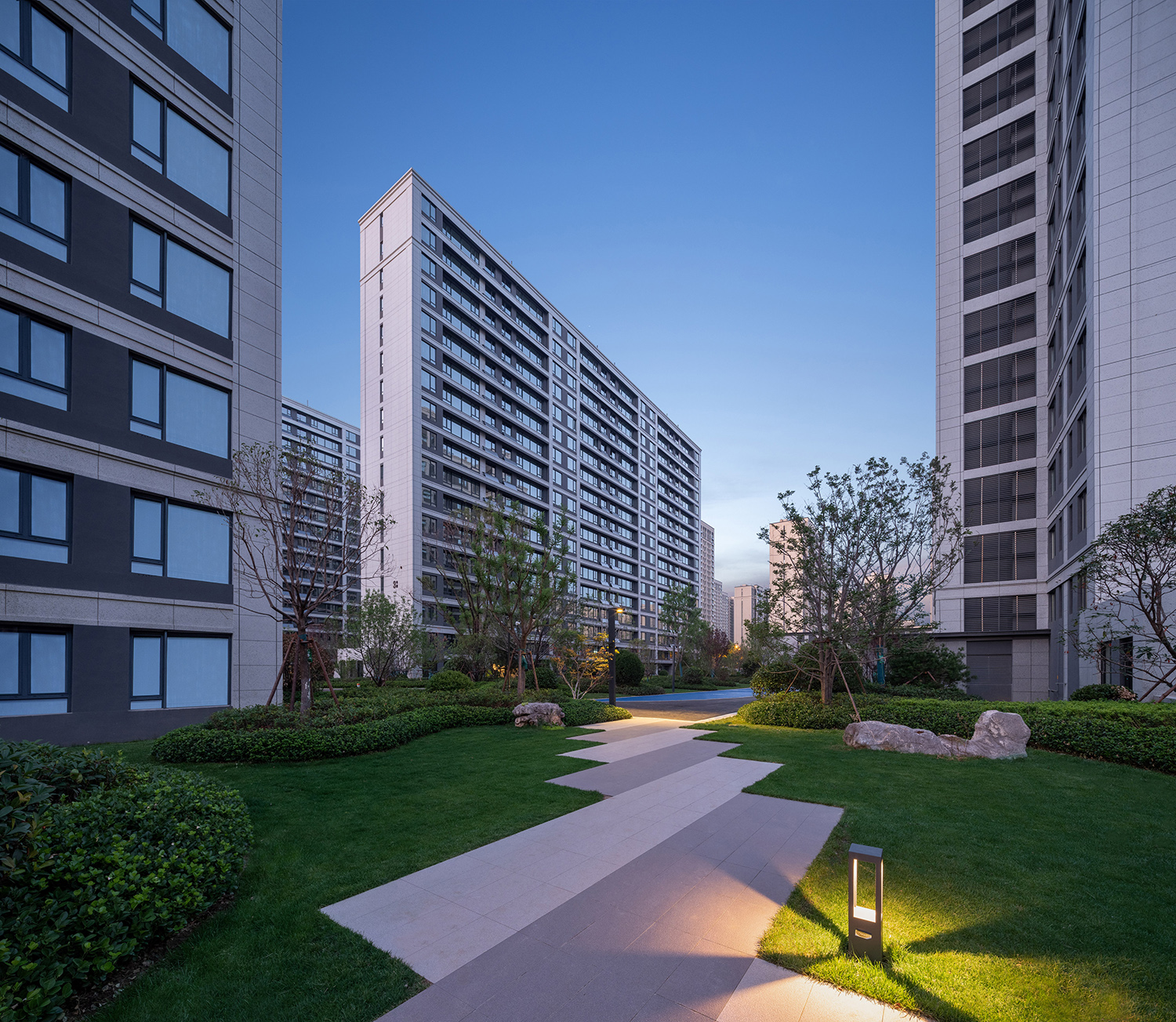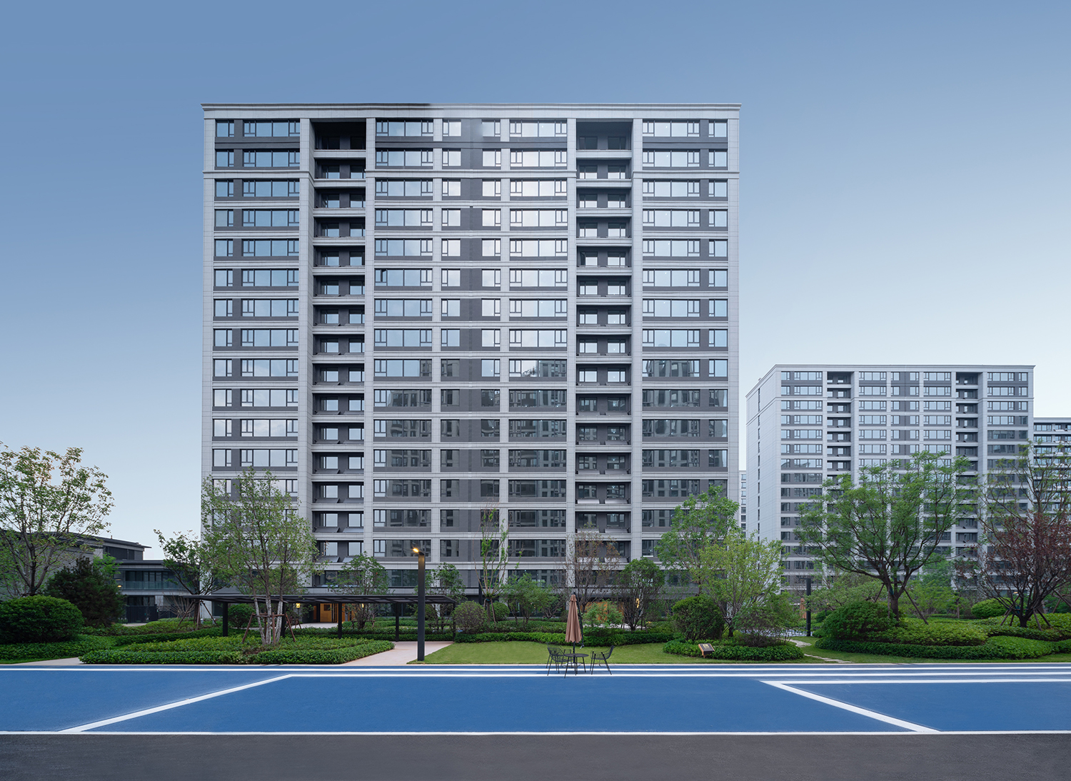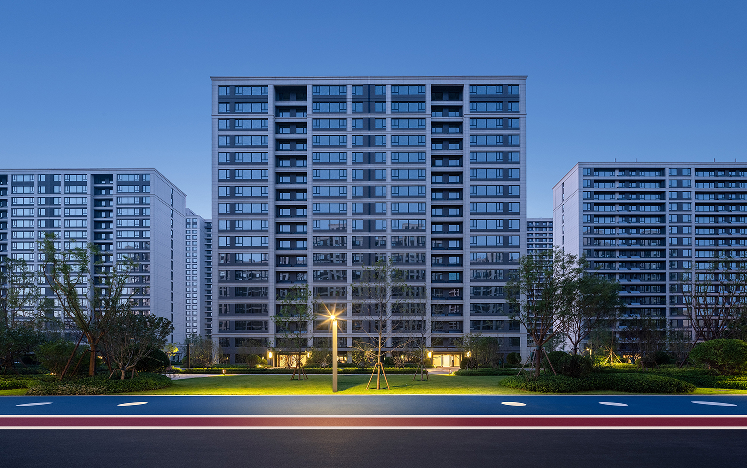 項(xiàng)目珍珠藍(lán)色調(diào)的大面積玻璃,映襯著天空和自然,提升了建筑的整體通透度,連續(xù)的陽(yáng)臺(tái)設(shè)計(jì)使得建筑立面平整,給每家每戶帶來(lái)充足的陽(yáng)光和開(kāi)闊的視野。建筑群在陽(yáng)光的映照下散發(fā)精致、莊重的氣息。