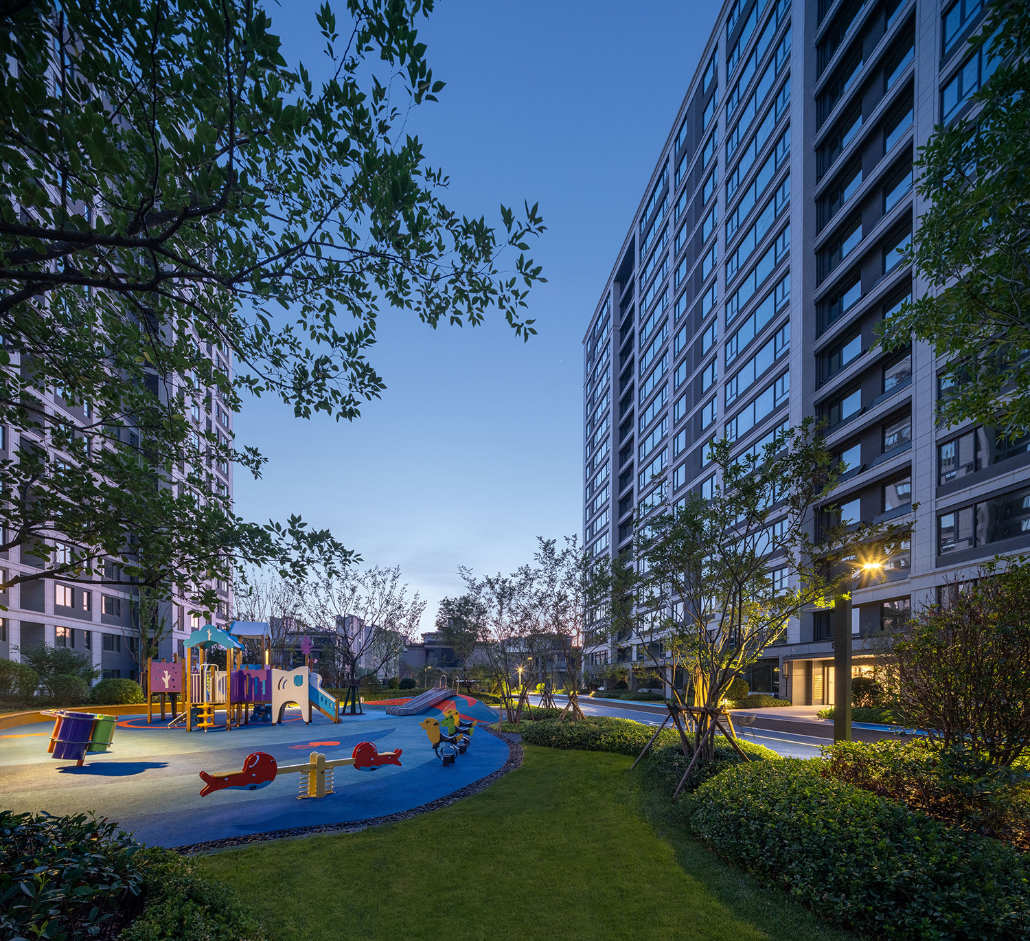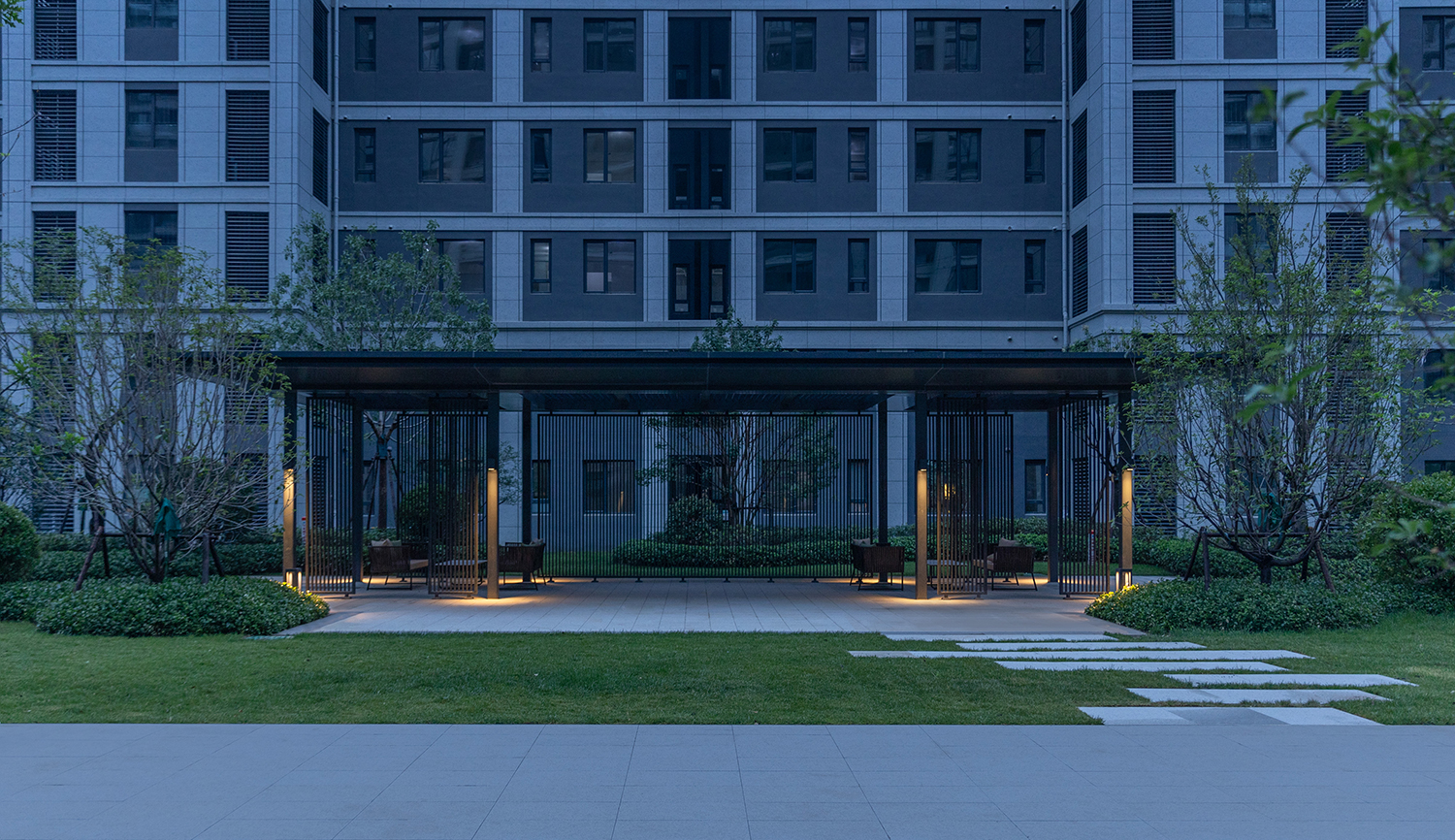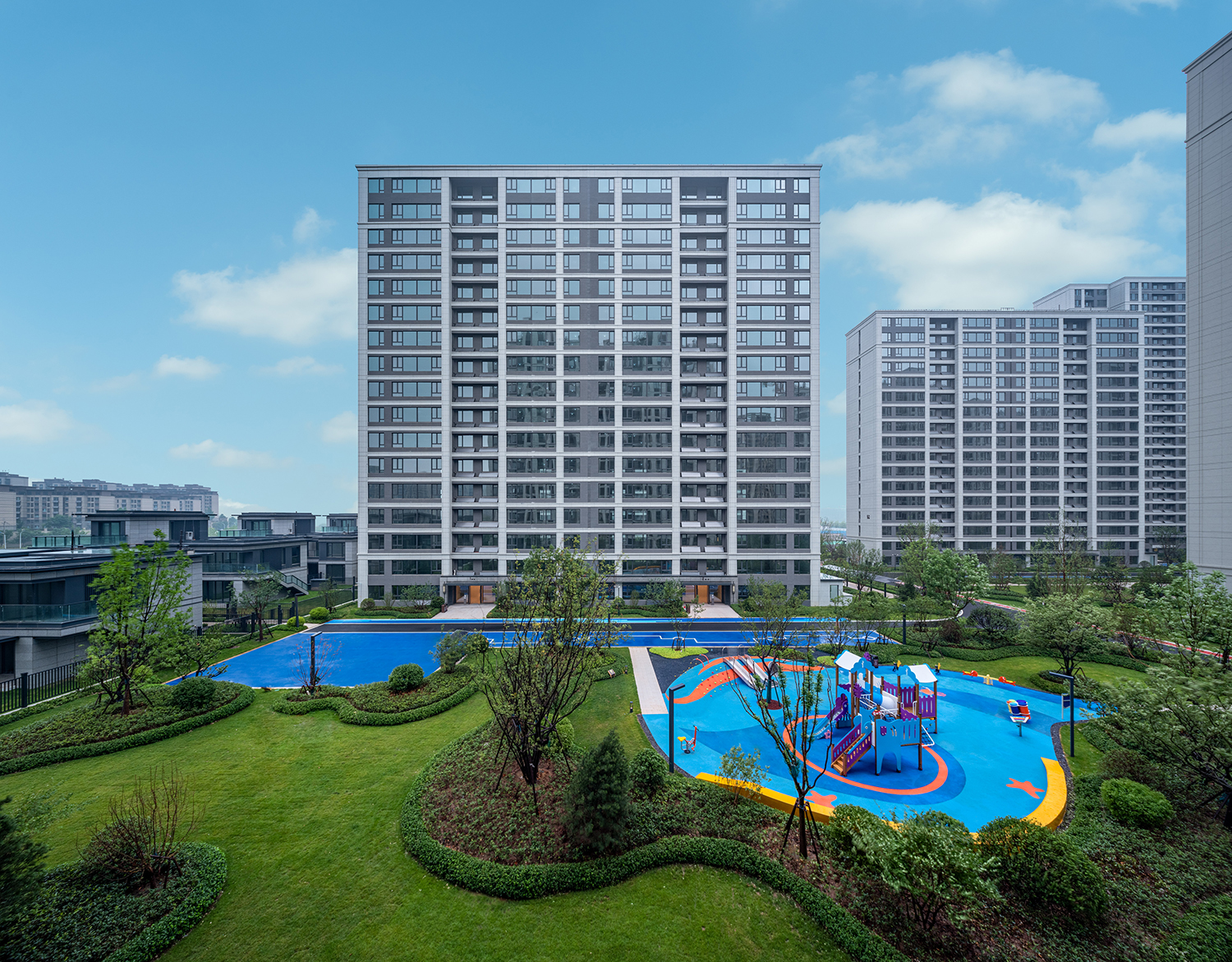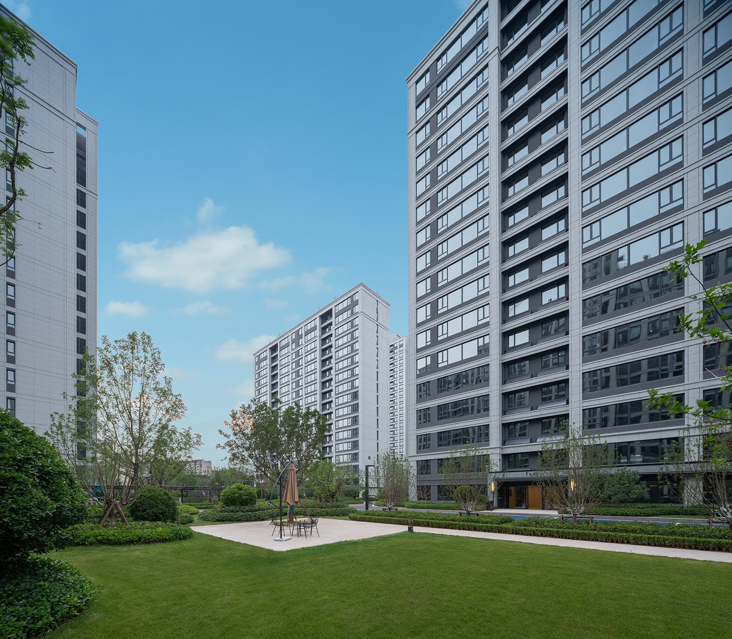 項(xiàng)目珍珠藍(lán)色調(diào)的大面積玻璃,映襯著天空和自然,提升了建筑的整體通透度,連續(xù)的陽(yáng)臺(tái)設(shè)計(jì)使得建筑立面平整,給每家每戶帶來(lái)充足的陽(yáng)光和開(kāi)闊的視野。建筑群在陽(yáng)光的映照下散發(fā)精致、莊重的氣息。