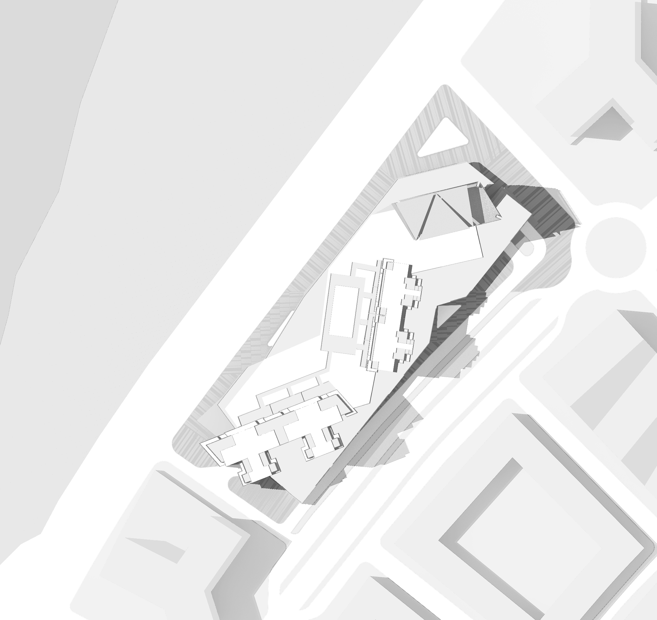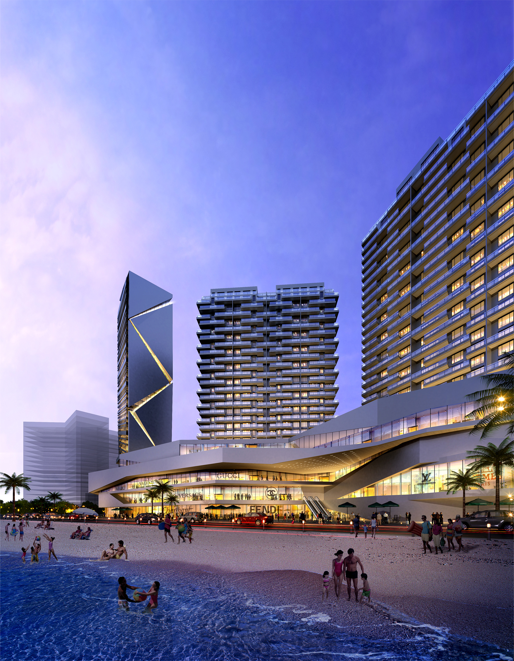 項(xiàng)目用地在安哥拉首都羅安達(dá)濱海港灣,緊鄰總統(tǒng)府,建筑層數(shù)受到限制,回填人造海灣地下室最多可下挖一層,而高端的濱海住宅和辦公及商業(yè)又有較高的車位配比率,占地面積較小,如何解決方案中的車行流線及停車問題是設(shè)計中的一個難點(diǎn)。每棟建筑的體量旋轉(zhuǎn),使得景觀視野最大化,并充分保護(hù)隱私,頂部躍層的退臺形成屋頂?shù)目罩谢▓@。辦公與會所頂部設(shè)有屋頂花園、游泳池等共享設(shè)施,與周邊底層住宅形成鮮明對比。商業(yè)的三層設(shè)置了帶有夾層的立體停車庫,立面上采用立體綠化,使得建筑變得可以呼吸,綠色生態(tài)在環(huán)境塑造上形成共生。合理利用現(xiàn)有的道路規(guī)劃,打造商業(yè)中心,并將商業(yè)氛圍延伸至全新打造的濱海景觀帶,創(chuàng)造更加豐富的濱海休閑商業(yè)??臻g體驗(yàn)活潑并且富有節(jié)奏感,整個立體形式都有條不紊。簡約的空間設(shè)計力求含蓄,達(dá)到以少勝多,以簡勝繁的效果。