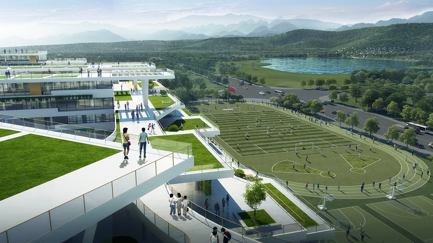 項(xiàng)目處于自然和城市的交匯地帶,我們將建筑的物質(zhì)空間形態(tài)與山林湖泊的自然形態(tài)相結(jié)合,借用自然構(gòu)筑舞臺(tái)讓師生與環(huán)境產(chǎn)生更為廣闊的對(duì)話(huà)。項(xiàng)目面向永樂(lè)湖和中梁山脈,為了更好的利用景觀(guān)、融合景觀(guān),我們?cè)诮虒W(xué)樓之間引入了靈活多變的立體觀(guān)景平臺(tái)組成課余生活交流活動(dòng)空間,構(gòu)成了校園中的“舞臺(tái)”和觀(guān)景美麗的自然環(huán)境“看臺(tái)”。