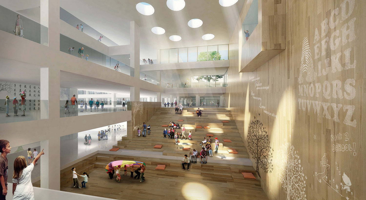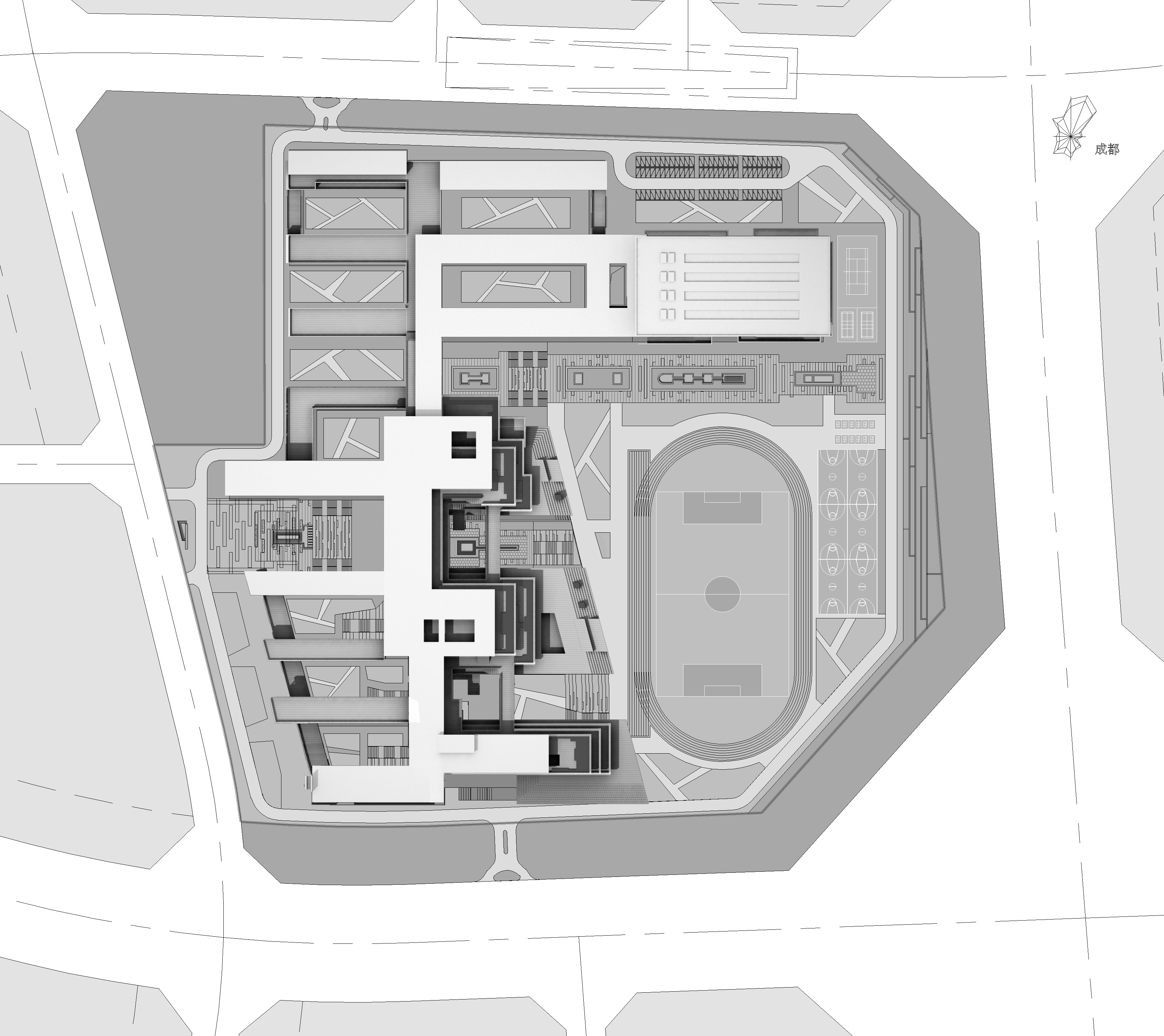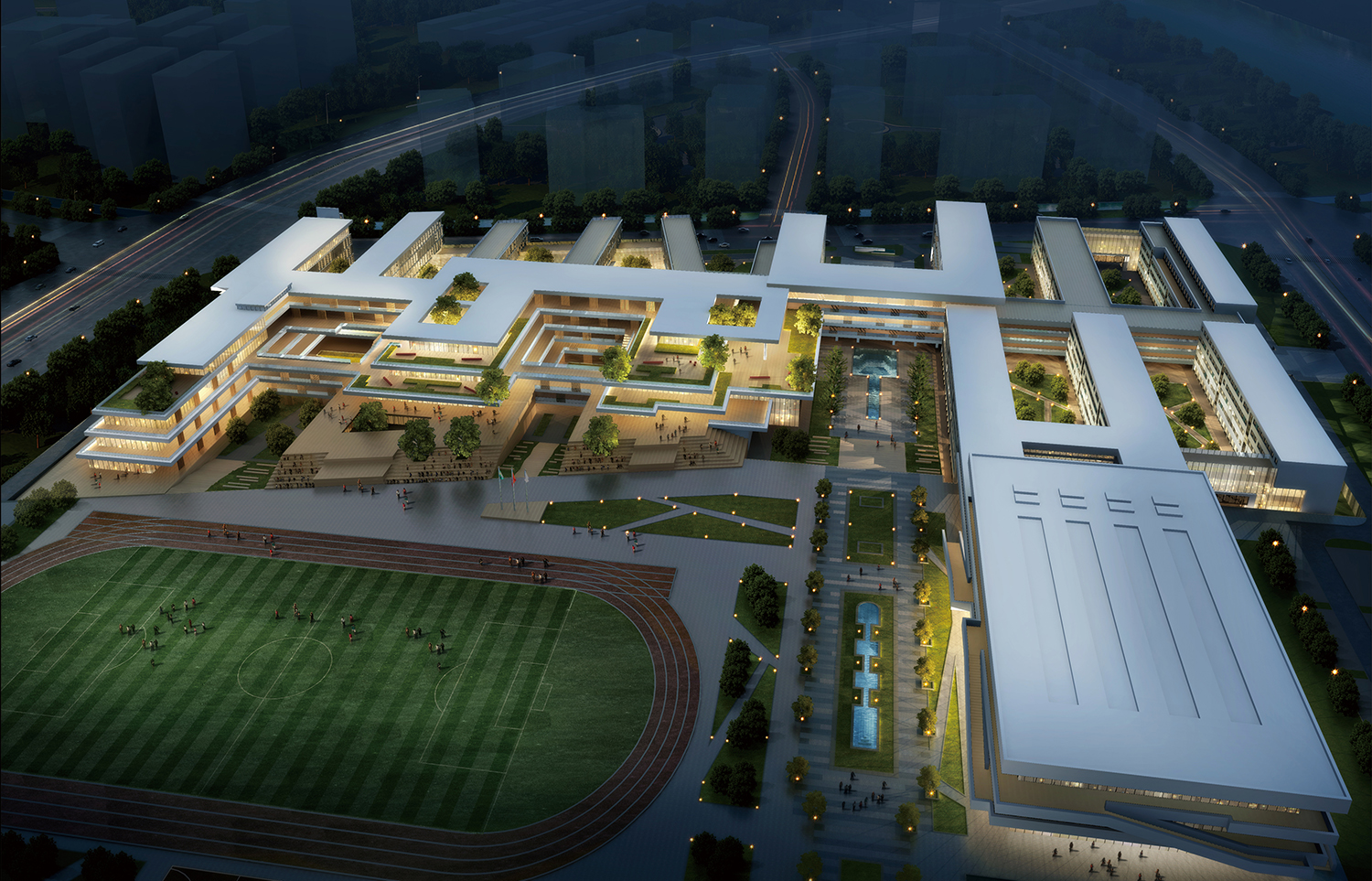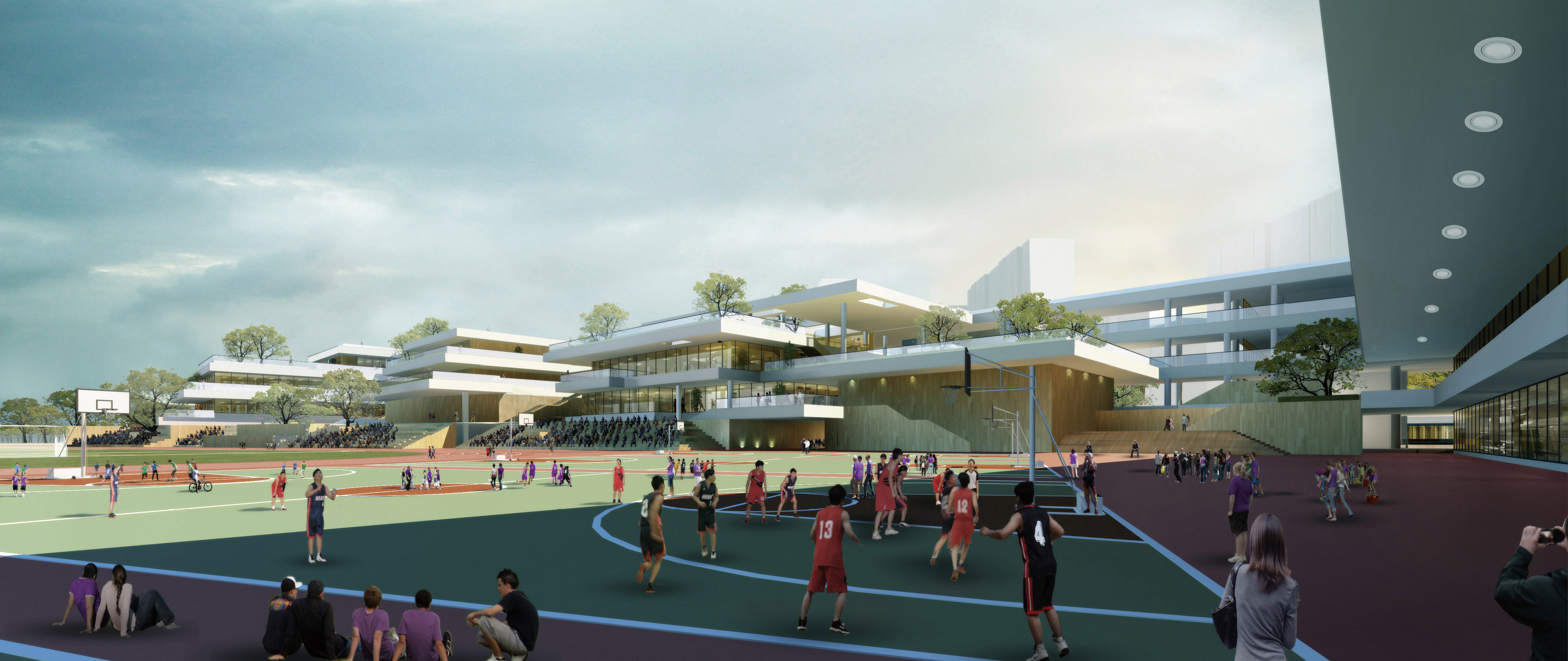 引領(lǐng)開(kāi)放的教育模式。中軸教學(xué)長(zhǎng)廊提供多樣化的教育空間,臨運(yùn)動(dòng)場(chǎng)建筑層層退臺(tái),