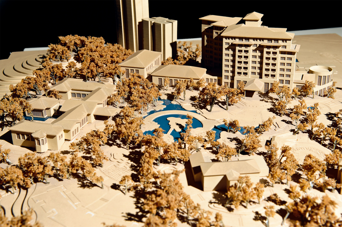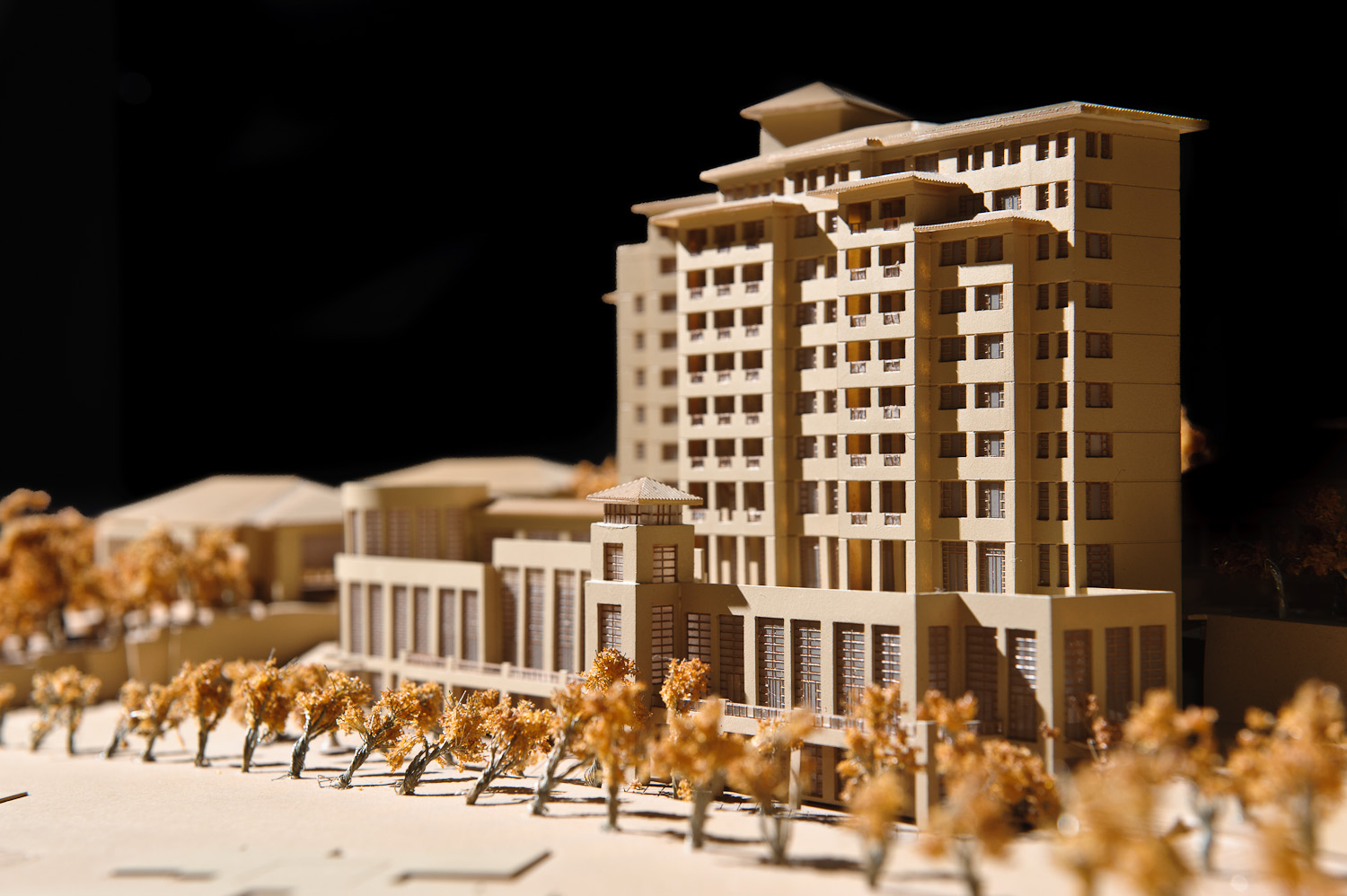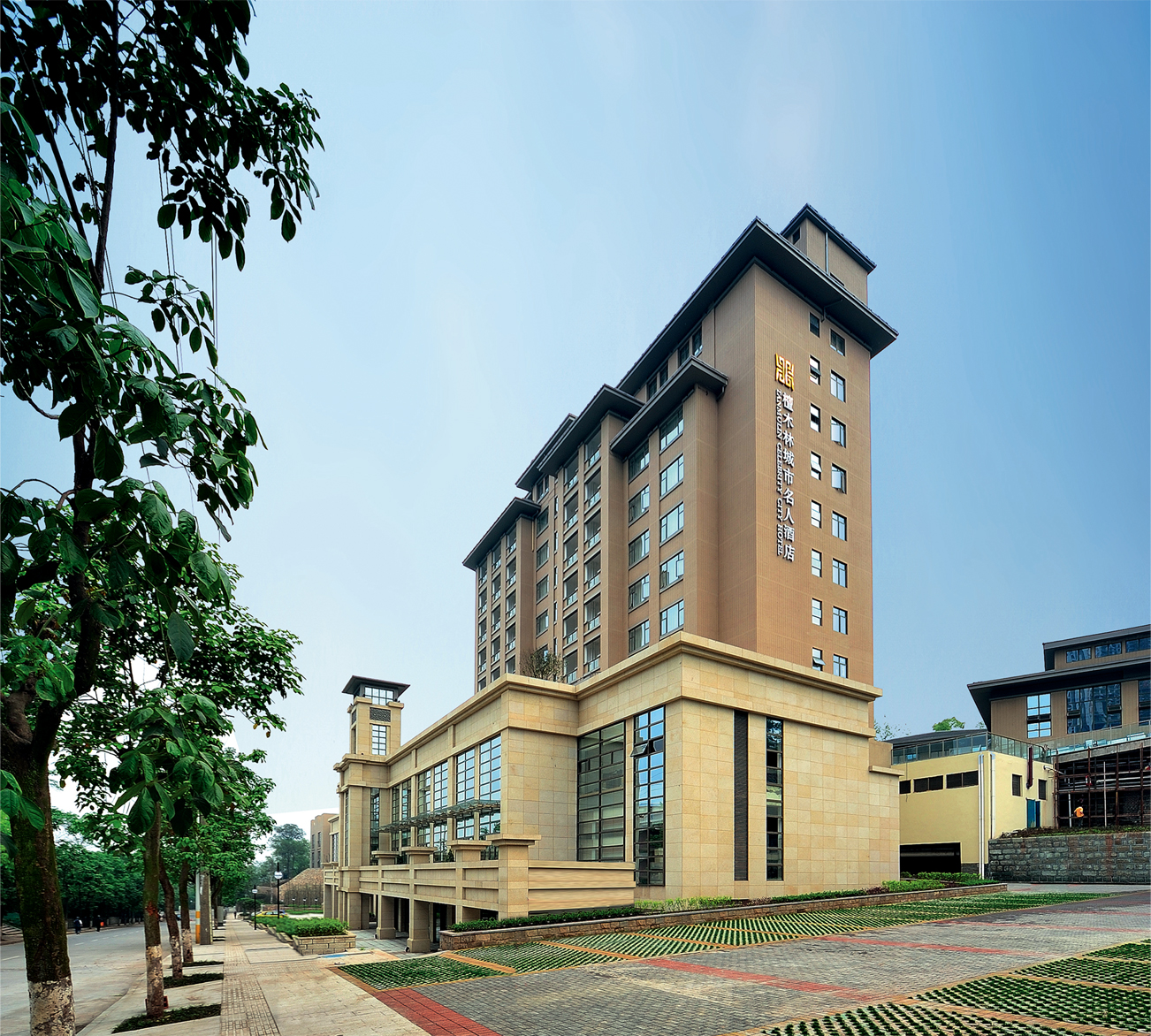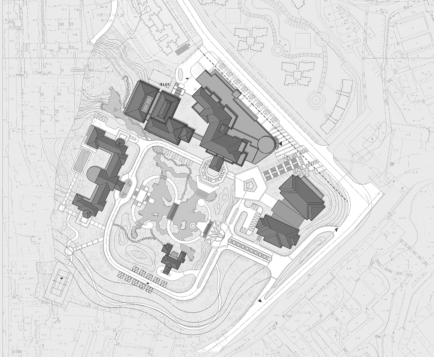 本案設(shè)計中采用圍合式規(guī)劃布局,將酒店內(nèi)部的庭院空間最大化釋放,整體建筑風(fēng)格以“新古典主義”配以地區(qū)特色的裝飾元素,體現(xiàn)穩(wěn)重高貴的氣質(zhì),景觀的主要概念源于自貢市的三大特色之一的燈籠,互相連接、包含的景觀元素,正是沿用了大小不一的燈籠連接一體的形態(tài)特征,置身其中,每向前邁一步,都有不同的景色出現(xiàn)在眼前,所有設(shè)計元素組合在一起最終形成與自然統(tǒng)一和諧的園林式五星級酒店。