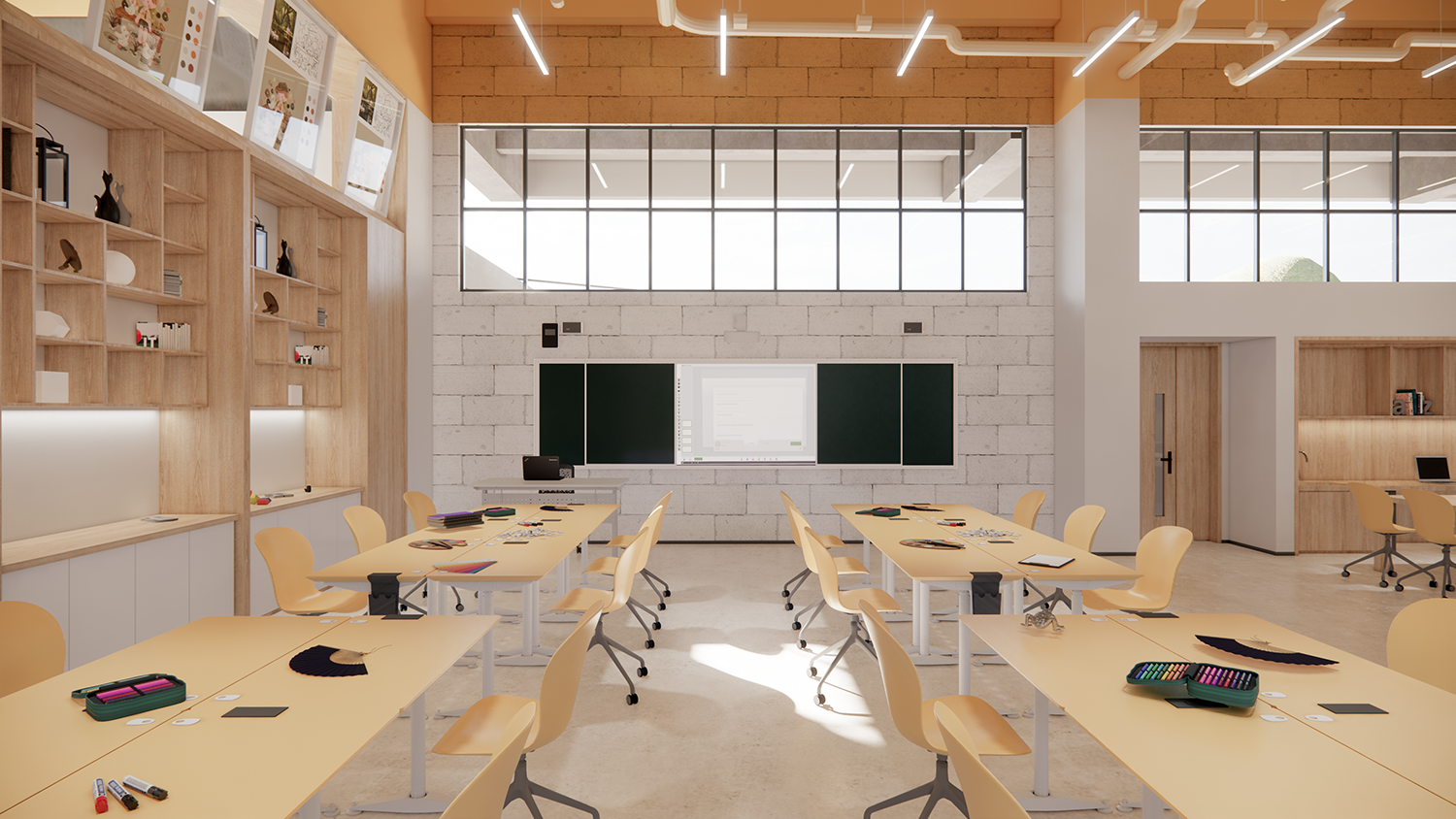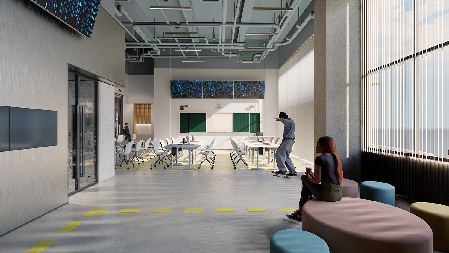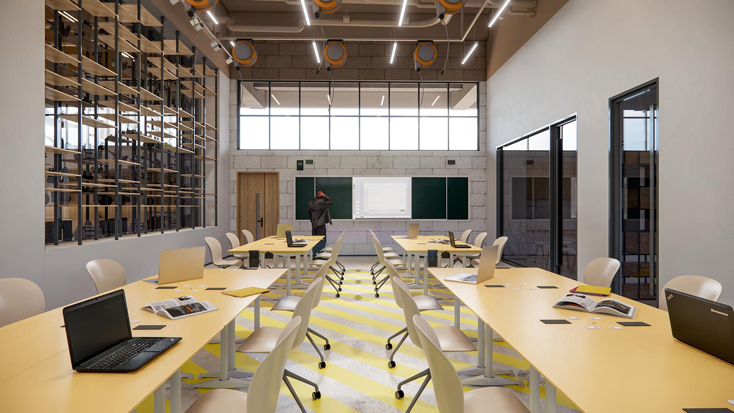 項(xiàng)目是一個先進(jìn)的科學(xué)和藝術(shù)探索中心,空間包括智能制造工坊,機(jī)器人工坊,時尚藝術(shù)工坊,人工智能工坊,數(shù)字音視頻工坊,生物探索花園,學(xué)生在這里可以實(shí)現(xiàn)跨學(xué)科學(xué)習(xí)。山鼎設(shè)計結(jié)合工業(yè)風(fēng)和綠色建筑的理念,為孩子們呈現(xiàn)極具現(xiàn)代科技感的空間感受。