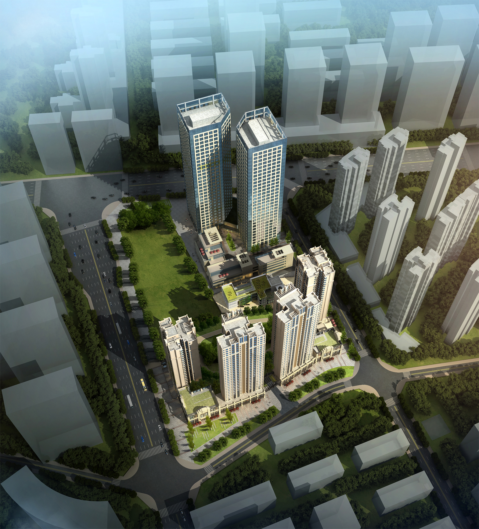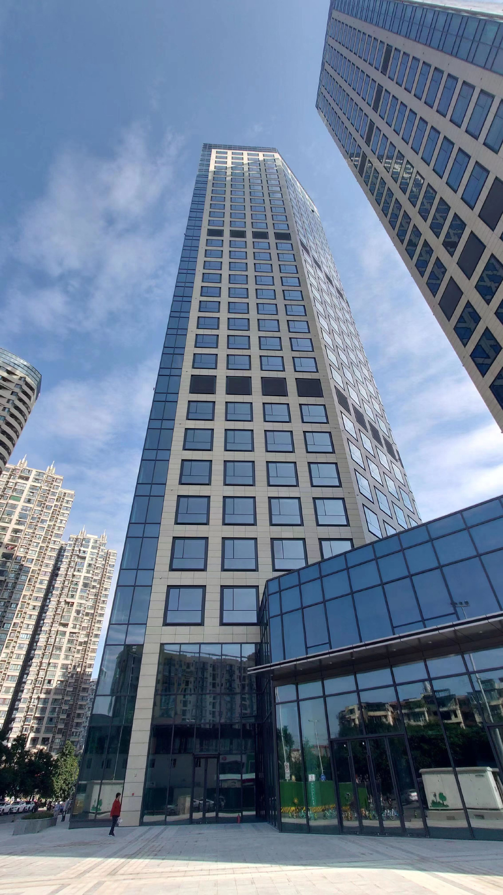 項(xiàng)目旨在打造城市中心區(qū)域的多功能復(fù)合、充滿朝氣和活力的居住、辦公、生活配套及學(xué)前教育綜合體,妥善處理四個(gè)功能的總體布局與空間層次關(guān)系,塑造地標(biāo)性建筑的立面風(fēng)貌,提升區(qū)域品質(zhì)。項(xiàng)目最富特色的辦公樓立面通過解構(gòu)主義手法突出建筑現(xiàn)代、時(shí)尚、創(chuàng)新的風(fēng)貌。辦公樓連接體造型取自握手的形態(tài),寓意和諧、友善的氛圍;外墻材料為玻璃幕墻結(jié)合白色穿孔鋁板的組合形式,減少幕墻比例,增加建筑的厚實(shí)感和韻律感。總體效果整體協(xié)調(diào),局部統(tǒng)一、特點(diǎn)突出,別有風(fēng)貌。