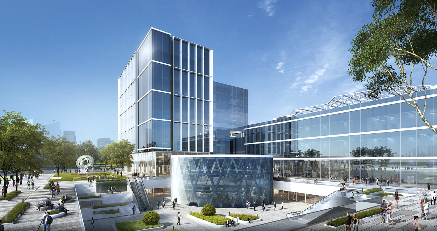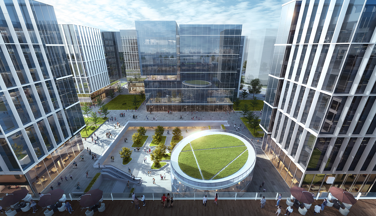 項目的創(chuàng)新之心下沉廣場位于園區(qū)的中心位置,下沉廣場的設(shè)置增加了地下建筑的使用率同時也美化了園區(qū),為園區(qū)內(nèi)工作的人員休閑娛樂、公共交流的活動場所。高品質(zhì)創(chuàng)新辦公樓平面采用“Z”字型布局,一層設(shè)置共享大廳,五層設(shè)置空中觀景平臺,滿足了樓內(nèi)工作人員的休憩需求,也使得立面變得活潑,不呆板。