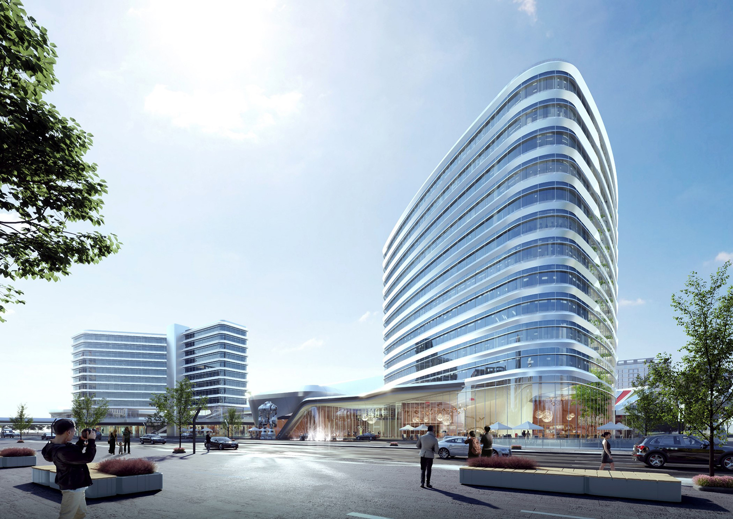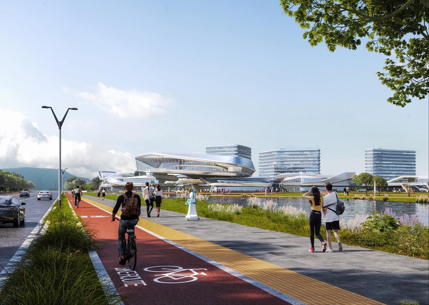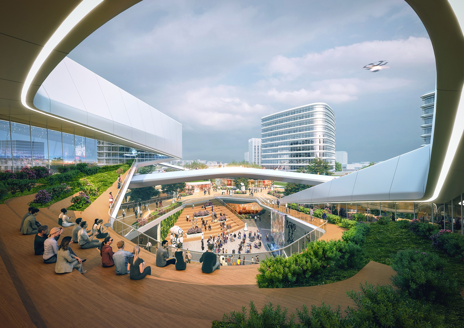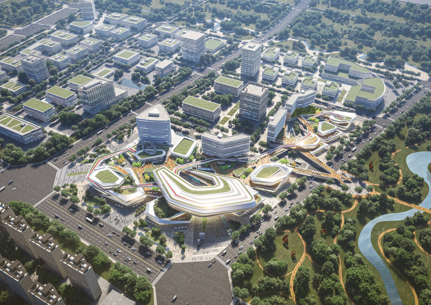 項目位于規(guī)劃中的成都雙流楊柳湖公園城市示范區(qū),距離成都雙流國際機(jī)場約為5.7千米,距市中心約19.5千米。根據(jù)創(chuàng)新空間的需求,將建筑空間切割分解為若干靈活空間,從而獲得更多商業(yè)展示面和更加自由的空間形態(tài)。通過二層連橋及平臺,將分散的商業(yè)服務(wù)空間鏈接起來,為各類人群提供靈活的公共交流空間。開放的公共空間、豐富的創(chuàng)意空間及合理的動線組織組成了智慧生活圈,將吸引更多人群,實現(xiàn)資源的共享。