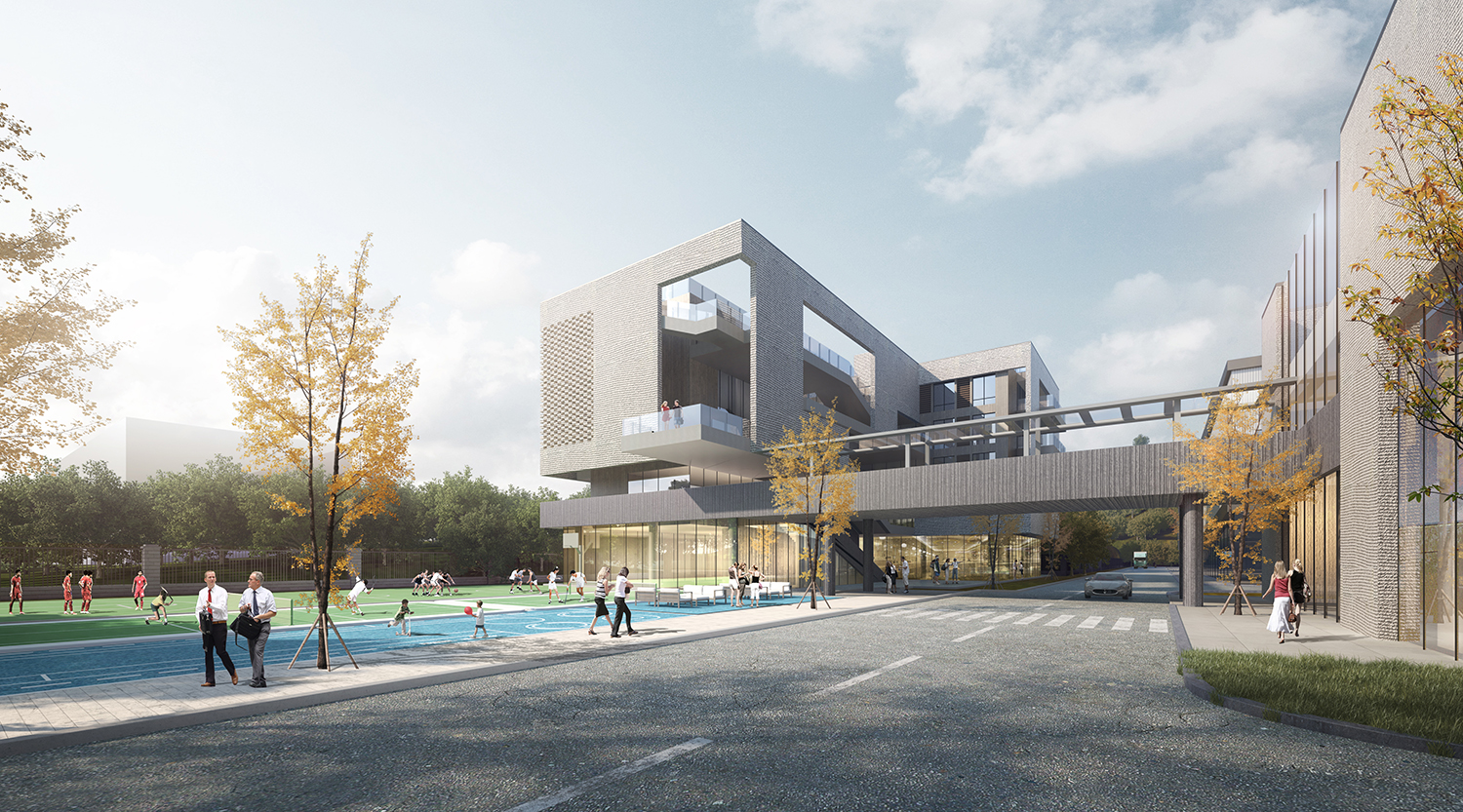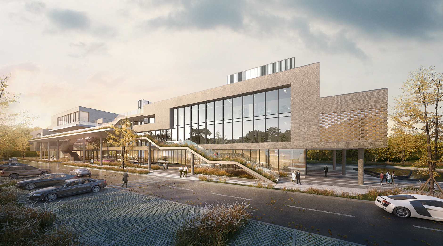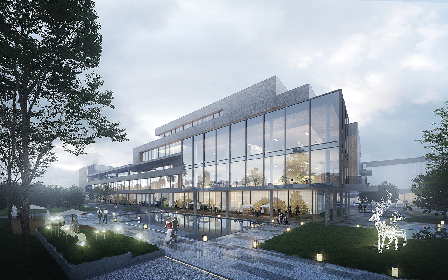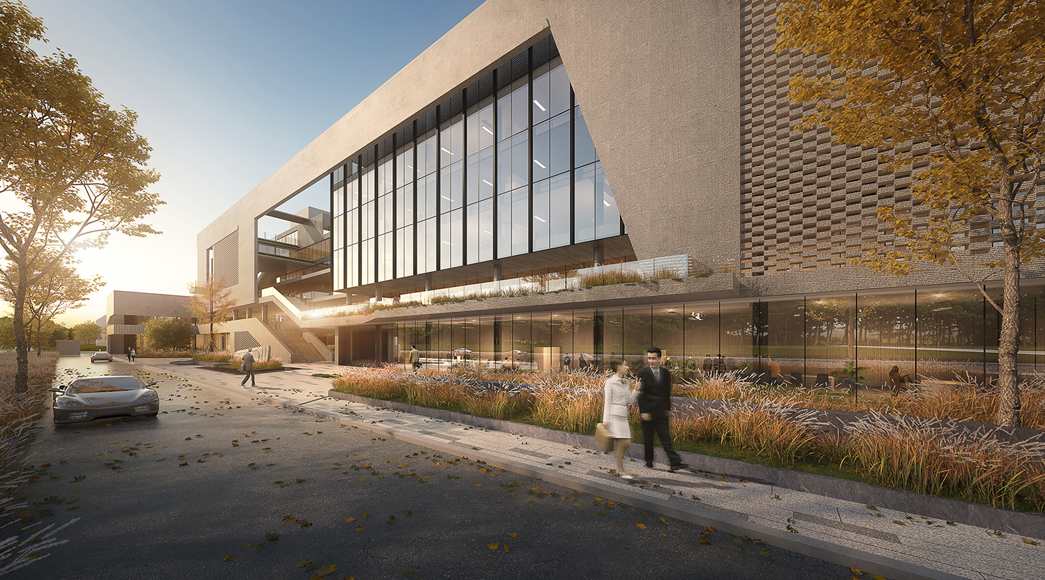 項(xiàng)目位于江西宜春市袁州區(qū),園區(qū)建筑包括多層綜合樓、研發(fā)生產(chǎn)樓、宿舍、廠房等。園區(qū)內(nèi)建筑采用現(xiàn)代風(fēng)格元素塑造高端企業(yè)的整體形象,辦公樓建筑立面采用石材加玻璃幕墻整體設(shè)計(jì)。研發(fā)樓層層退臺(tái),與南面枯山形成體塊呼應(yīng)關(guān)系。廠房立面根據(jù)線條上下波動(dòng),形成有韻律建筑氛圍。廠房的采光設(shè)計(jì)采取一層大面積玻璃幕墻及屋頂開窗的采光方式,使得較大體量的廠房采光得以解決。
