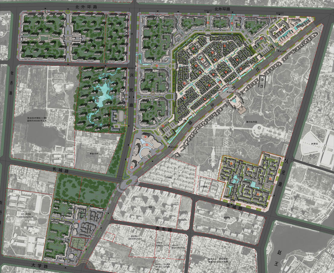 設(shè)計中在保留故有的人性化的街、巷、院的傳統(tǒng)空間尺度,豐富的古建筑肌理,及建筑和民俗符號的同時,修舊如舊的穿插或延伸一些新的商業(yè)業(yè)態(tài)。同時在廣場的重要節(jié)點,或復(fù)制或修繕曹州古城所特有的精神堡壘 ,有如縣衙 書院 試院 古戲臺 文廟 蓬萊閣 演武廳等。我們在保護(hù)傳統(tǒng)歷史街區(qū)及建筑的同時,使原有的傳統(tǒng)民俗與未來新生活融合在一個可持續(xù)發(fā)展且具有獨特魅力的豐富的城市風(fēng)貌建筑群之中。