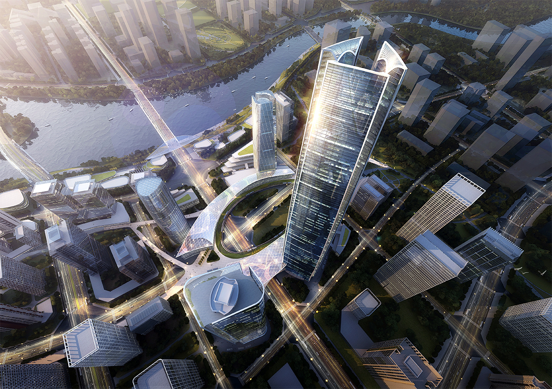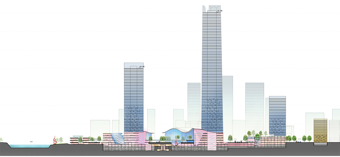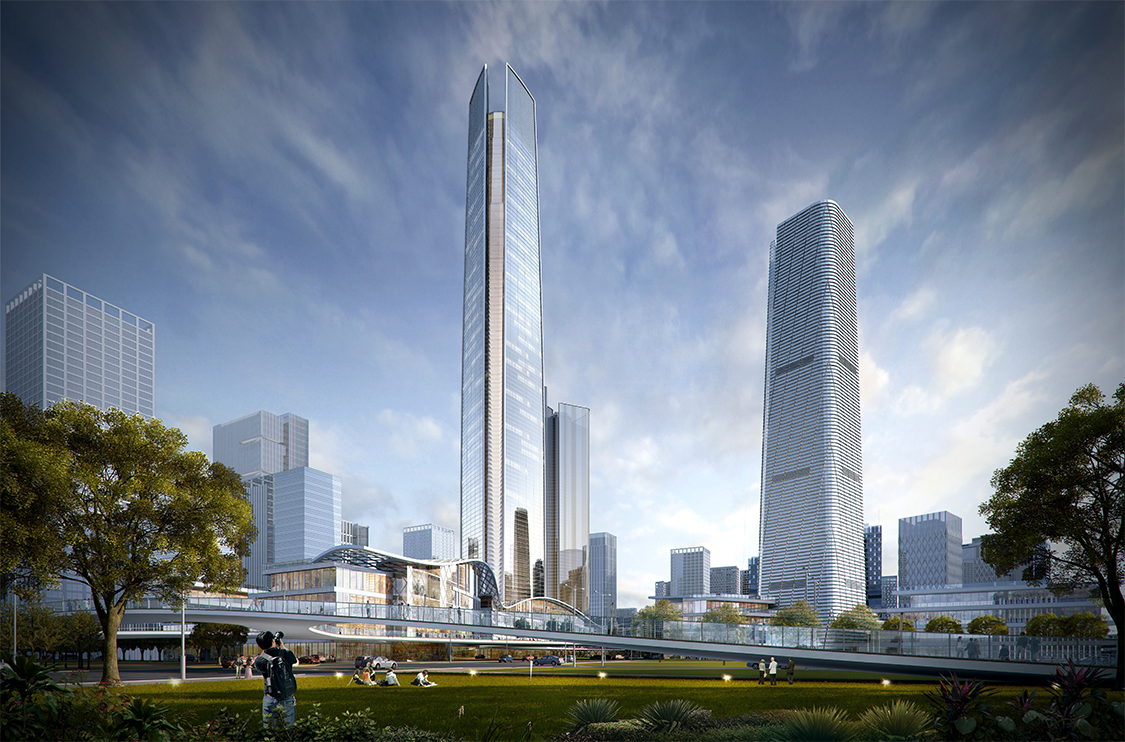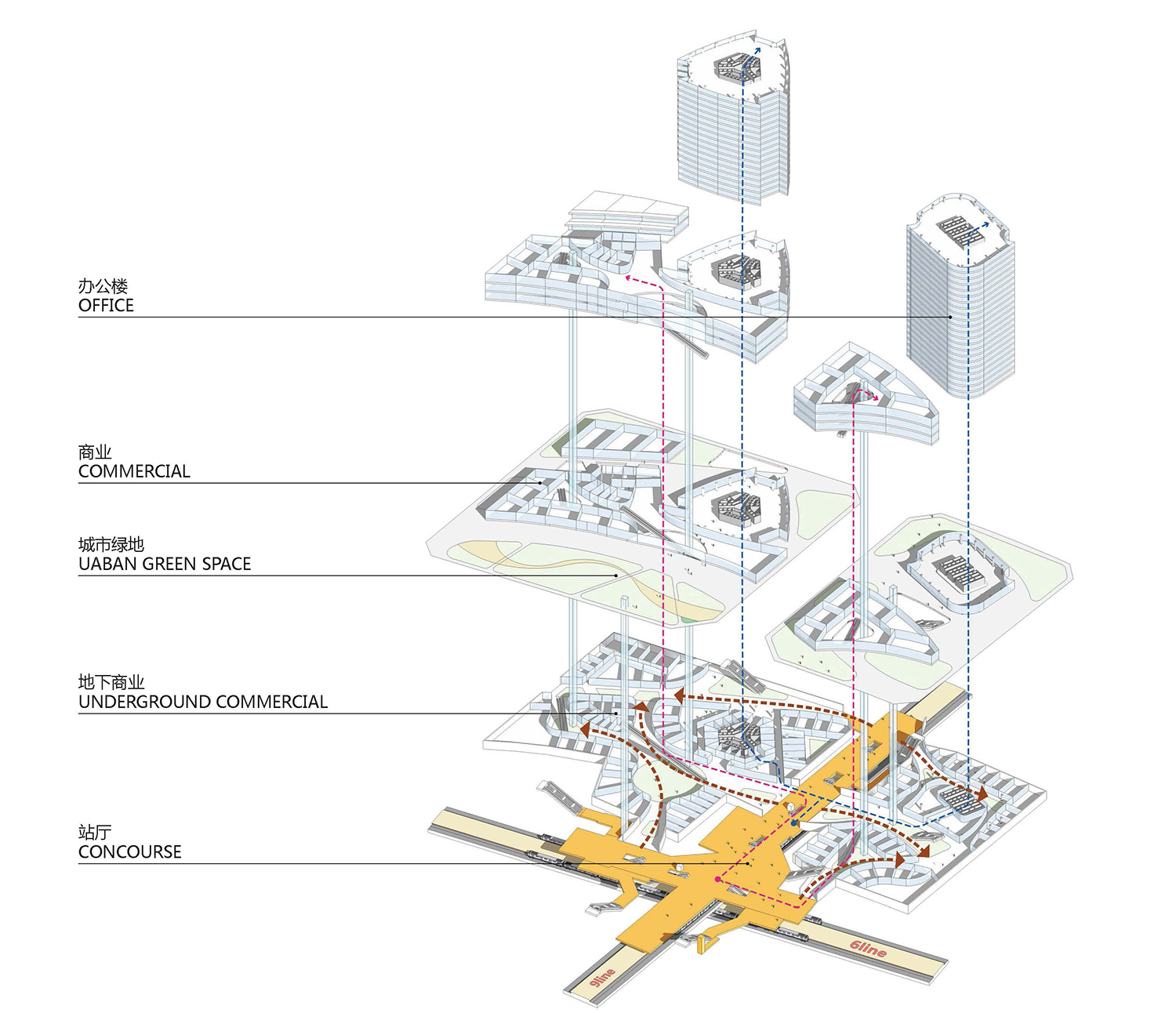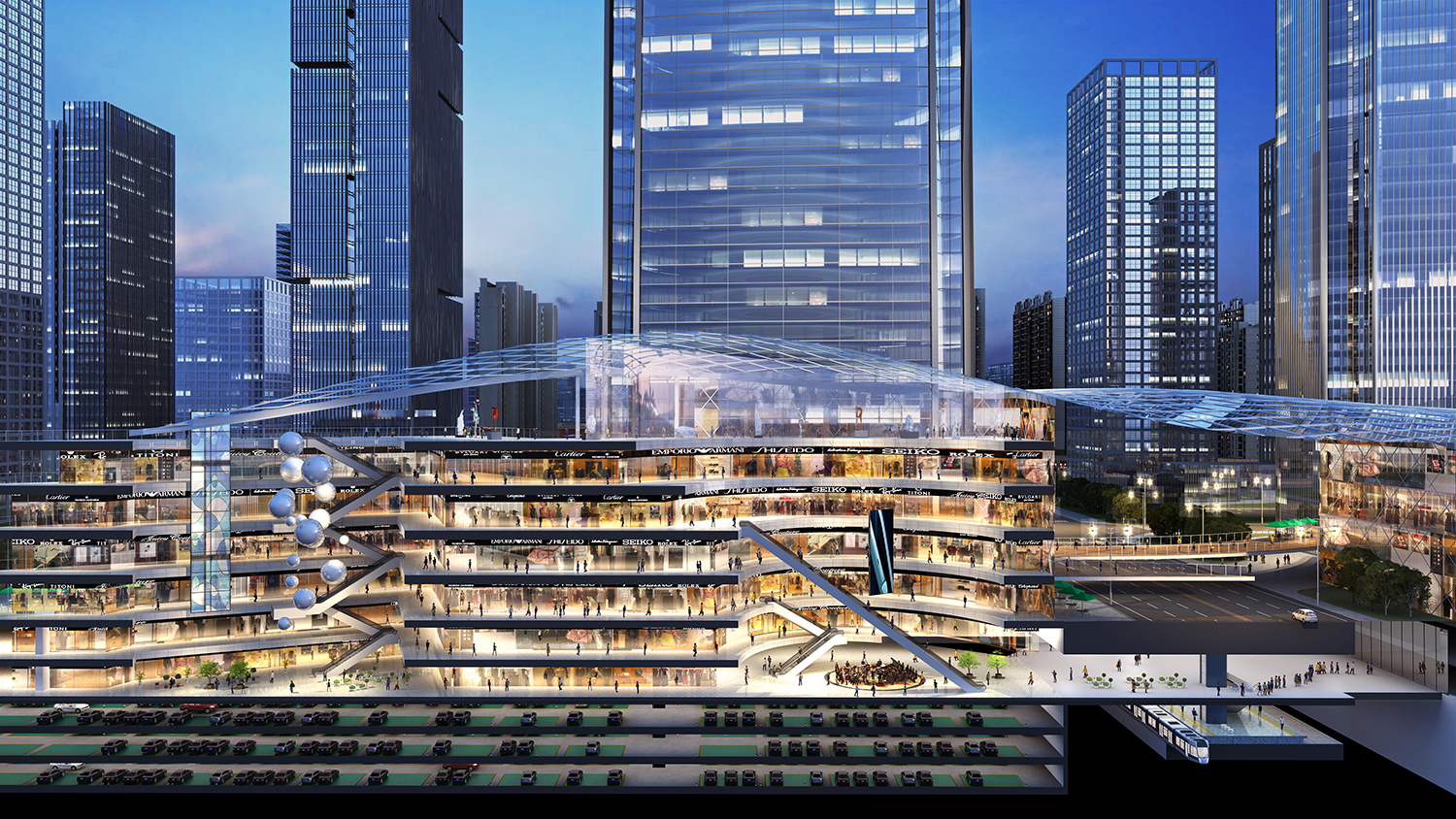 項(xiàng)目位于中央商務(wù)區(qū)核心地塊,著力打造以地鐵6號(hào)線及9號(hào)線交通優(yōu)勢(shì)為導(dǎo)向的中央商務(wù)區(qū),匯集了城市軌道交通、BRT、公交以及城市空中慢行系統(tǒng)等多種方式的立體交通體系。商業(yè)開(kāi)發(fā)模式由原來(lái)的單一商業(yè)開(kāi)發(fā)轉(zhuǎn)變?yōu)榧壍澜煌?、金融、商?wù)、辦公、居住、休閑娛樂(lè)為一體的TOD綜合開(kāi)發(fā)模式。 項(xiàng)目區(qū)域內(nèi)軌道地下交通空間與各地塊相連,打破常規(guī)站廳層形象,行人可以從地鐵站廳層到達(dá)地下商業(yè),或者前往超高層辦公區(qū)域,也可通過(guò)飛天梯直達(dá)地上商業(yè)高區(qū)。地鐵站廳層設(shè)立藝術(shù)、生活及服務(wù)空間,與二層景觀廊橋結(jié)合,營(yíng)造出一個(gè)集娛樂(lè)、休閑、文化、出行為一體的城市會(huì)客廳。