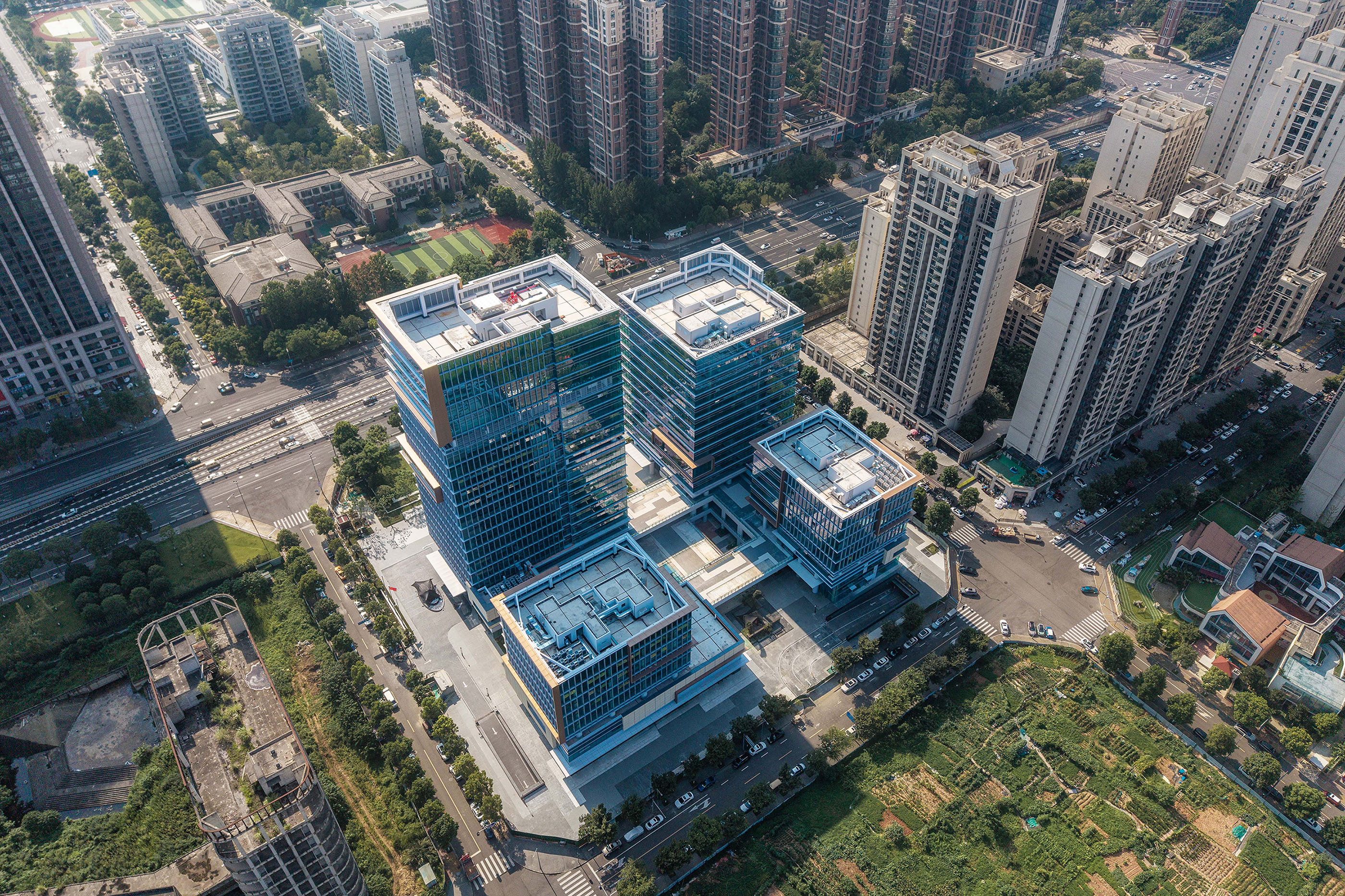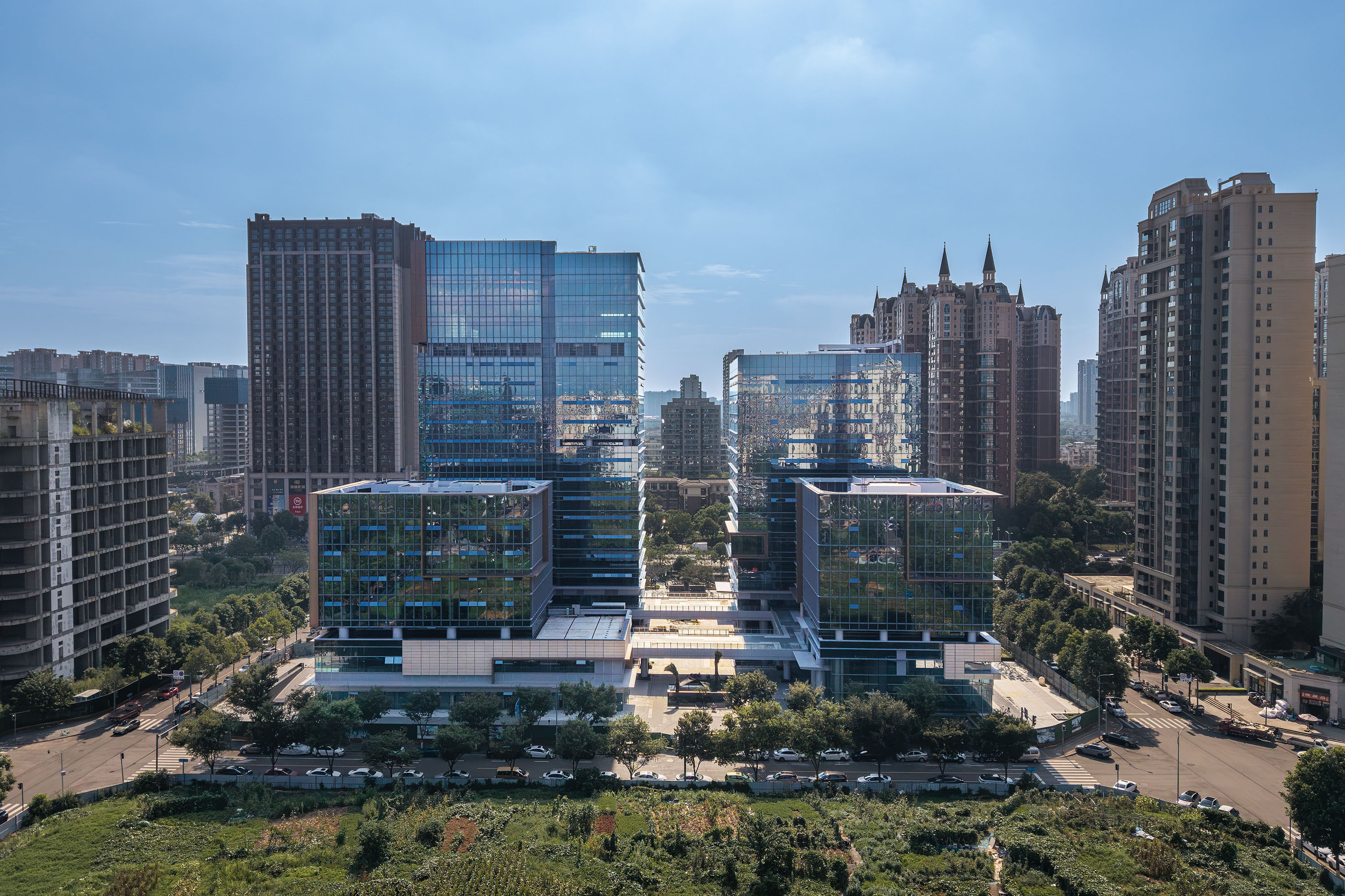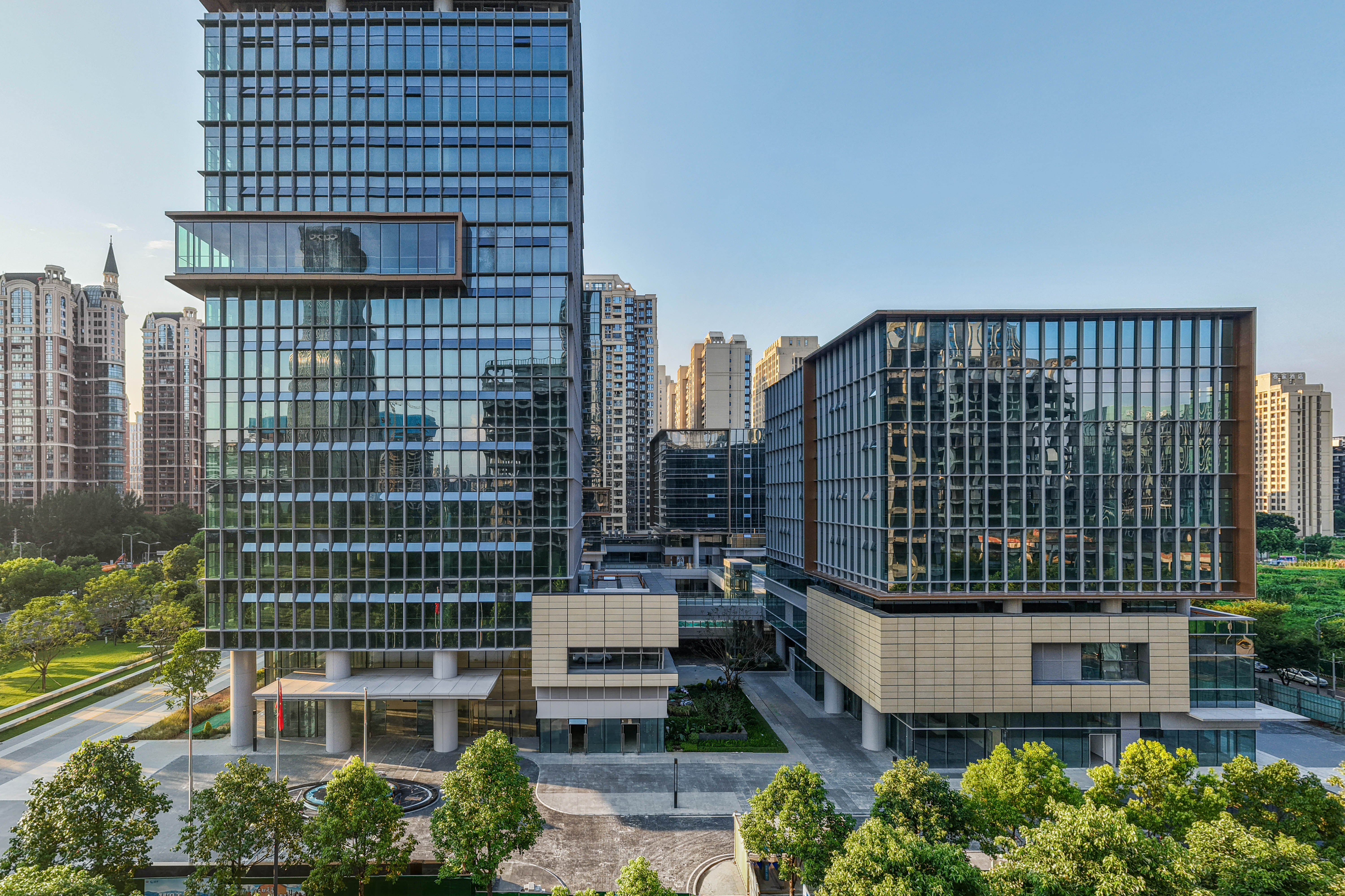 項(xiàng)目主要包括四棟辦公樓、裙房及中間圍合而成的廣場(chǎng)。高低錯(cuò)落的兩棟塔樓臨近西側(cè)城市主干道,另外兩棟低層辦公樓位于項(xiàng)目東側(cè)。四棟建筑形成錯(cuò)落有致的空間形態(tài)和連貫而豐富的城市天際線。標(biāo)志性的裸眼3D屏幕位于項(xiàng)目最高辦公樓的頂部,是宣傳、引流的高新之窗。